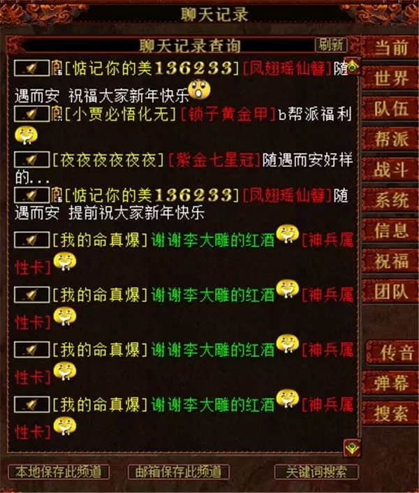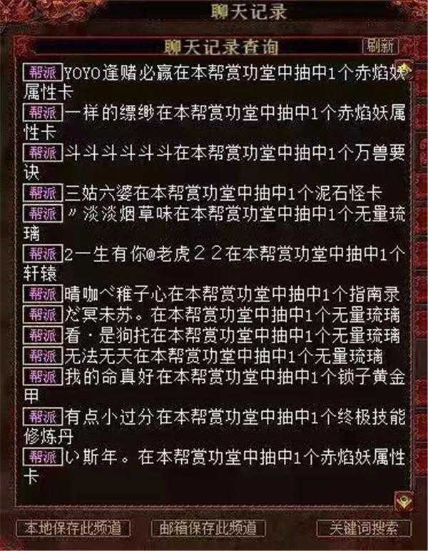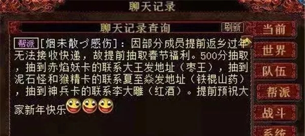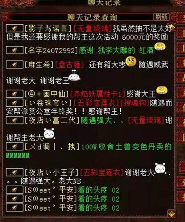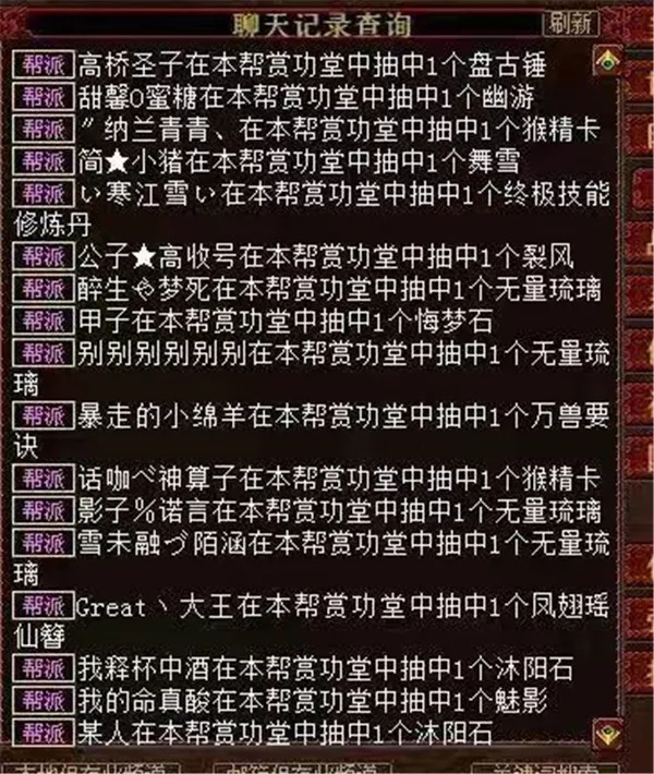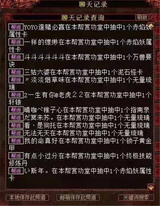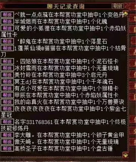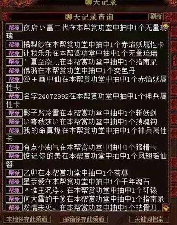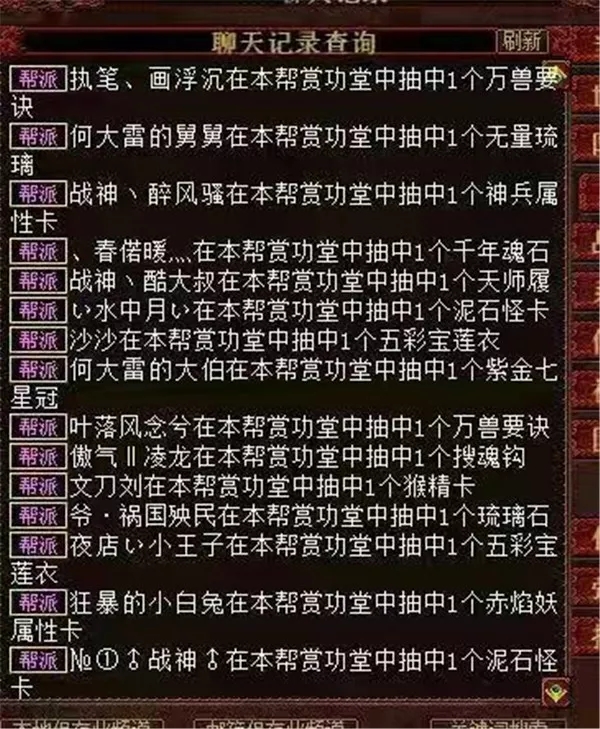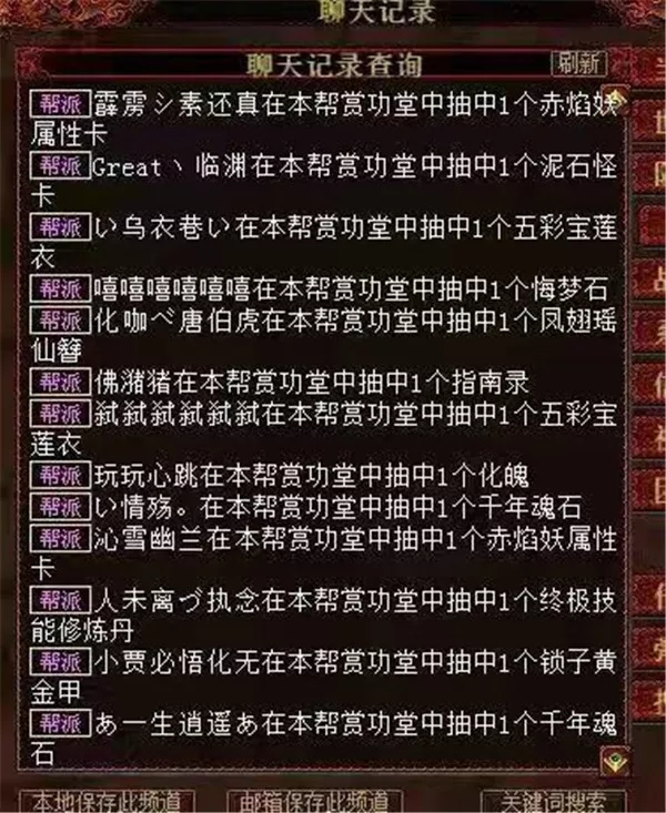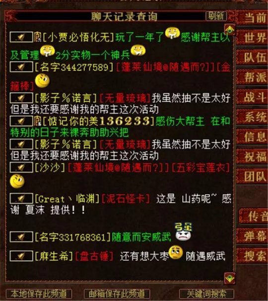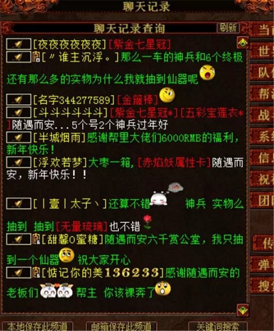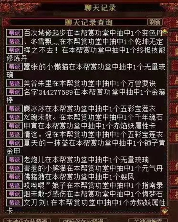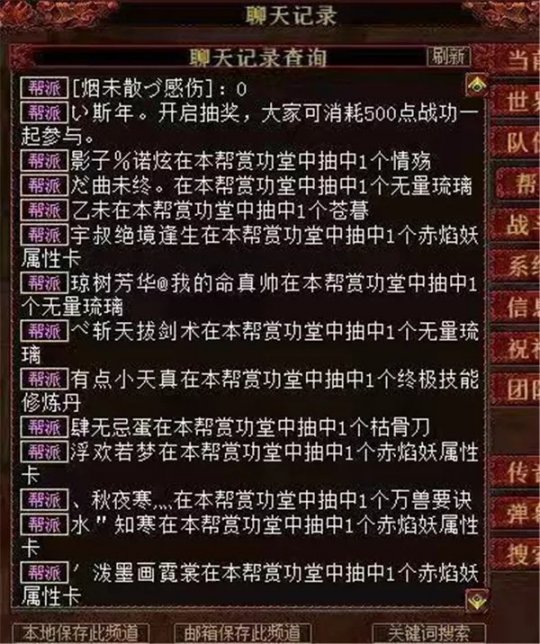 新年之际,不知各位小伙伴们的帮派有什么活动没有?小黑呢一直在一个养老院欢乐的成长,帮主神龙见首不见尾,偶尔看见在线迅速去问好,帮主回复一个微笑,然后就不在线了…… 咳,回归正题,落寞的小黑今日给大家分享一期别人家的帮派,不仅有满屏的神兵,还有别具心意的实物,先奉上赏功堂的图片! 满屏的神兵和贵重物品实让人眼馋,这到底是什么神仙帮派,小黑也好想去!!!肯定也有小伙伴注意到在这些贵重物品中竟然还有变身卡?这是什么操作??? 好了,下面小黑就带着小伙伴们冲进服务器一生有你寻找这个帮派,一起来了解下吧! 一生有你服务器:随遇而安帮派