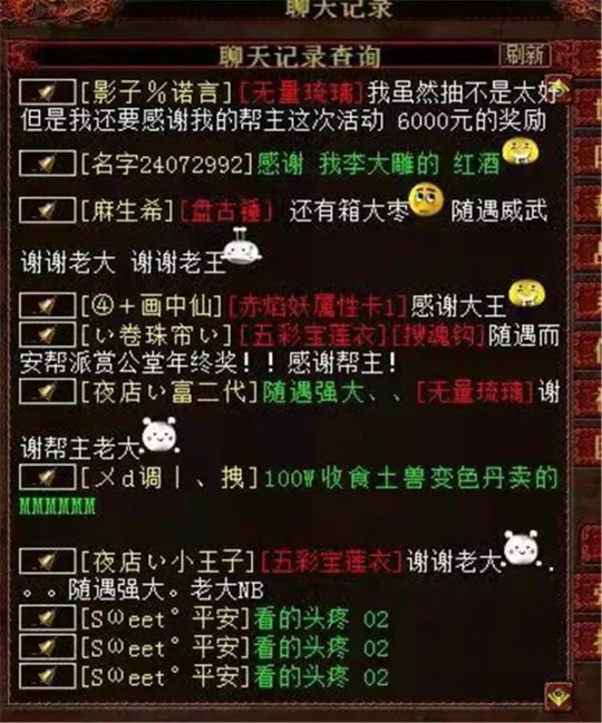 在一生有你服务器帮派排行榜中,第一名正是小黑要联系的帮派,有幸采访到了他们的帮主,最后他也表达了下自己的心愿。 【采访语录】 小黑:帮主你好,我是叶子猪记者,是否方便聊几句? 烟未散感伤:可以。 小黑:看到贵帮在一生有你服务器排行第一,不知你做帮主多久了? 烟未散感伤:2,3年?忘记了。 小黑:贵帮在赏公堂放了很多贵重物品,你这个帮主有心了,听说抽到变身卡的小伙伴是给实物,能否说一说? 烟未散感伤:实物是帮里的我的命、夏至焱、大王还有李大雕放的,其他是我放的。 小黑:能否说下实物具体有哪些吗? 烟未散感伤:实物有红酒、铁棍山药、枣夹核等,这些都是帮派管理和帮众家乡的特产。 黑:说明大家对这个帮很上心哦,一个帮不能只靠帮主单打独斗,可以看出你们帮挺团结有爱。 烟未散感伤:我是我们帮打酱油的,帮战那些主要靠帮里的成员。 小黑:是什么动力让你做这么久的帮主呢? 烟未散感伤:工作之余大家游戏放松放松,不知不觉时间就过去了。 小黑:管帮还是比较耗费精力的。 烟未散感伤:我就相当于一个群主,管管收人清什么的。 小黑:所以基本帮派是管理们来打理吗?说明你很会用人。 烟未散感伤:还好吧,管理们也不怎么管,主要还是帮里的人不错,自觉,觉悟高。 小黑:咳,发现你说话特直爽,和你对话我有点转不过弯来,不知道你玩大话多久了? 烟未散感伤:玩大话断断续续也14,15年吧。游戏太高端,物资太贵我都快玩不起了。 小黑:言下之意游戏投资越来越好多,但是你始终在这里,大话有什么魅力吸引你一直停留在此呢? 烟未散感伤:大话还好,工作之余娱乐下。虽然投资比较高吧,但至少最后不玩还可以处理些,不像其他游戏纯投资。 小黑:说的也是,很少有像大话这样还可以卖钱的游戏了,真的很感谢你接受我的访问。 烟未散感伤:谢谢,也希望多来血队挑战!虽然我们全服帮战在前50名,但是还是想往前再走走,缺血队挑战。 小黑:好的,还有什么想说的吗? 烟未散感伤:非常感谢你,希望你可以多来一生有你采访下其他玩家。 小黑:必须的,如果你有朋友有什么乐意非常的都可以联系叶子猪哦,祝你游戏愉快! 烟未散感伤:祝玩家们新年快乐,游戏记得平常心。游戏嘛,就是尽量别太高端了,不然玩不起了#127 【尾音】 采访到这,小黑原本想溜达下他的大话空间,结果发现什么都没。这位大哥笑着说他是真的很懒,平常号都是靠代理。 为啥这样的帮主都是人家的帮主呢?为啥这样的帮派都是人家的帮派呢?小黑突然很想召唤自家帮主:赶紧上线给我准备点新年礼物吧,我可是对你不离不弃的! 好了,本期采访就分享到这,如果小伙伴们有什么想分享的赶紧来叶子猪爆料吧! 最后的最后奉上一波一生有你服务器随遇而安帮派奖励图: [编辑:米奈]
