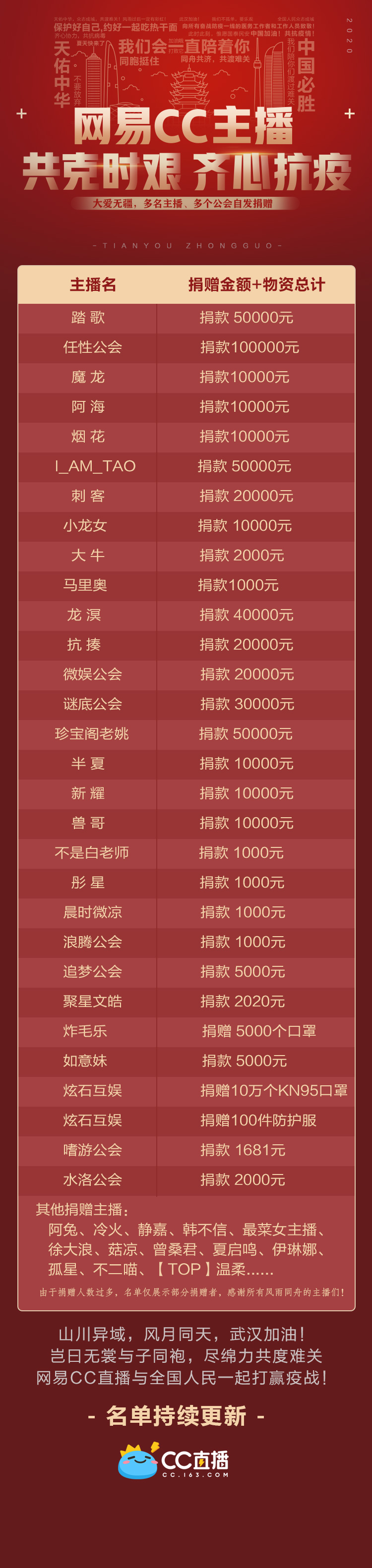 Q:您的家人朋友同意自己做法吗? A:我觉得自己所做的,相对于一线工作者并不算什么,作为一名大话玩家、一名CC主播、一名普通中国人,对社会的责任感,我觉得在我自己力所能及的范围内,尽我的微薄之力,我相信他们绝对会支持我的。 Q:CC直播官方这边对于你捐赠是什么态度? A:CC直播一直在做抗击疫情的工作和措施,但是官方对于主播捐款的这个事情来说都是自愿的。就是我们主播怎么捐,官方是不干涉的,对于这次捐款,官方是非常支持的。对于很多捐款的事宜,我很多都不懂,也不太明白,官方一直在帮助我了解这些事情,让我完成这次的捐款。 Q:能谈下您对这次疫情最深的感受吗? A:对于这次疫情,国家众志成城抗击疫情,一线人员的无私奉献,社会组织的同舟共济,我们普通老百姓的团结配合,CC官方、CC主播以及很多的CC观众,对疫情都尽自己力所能及的支援! Q:聊完比较沉重的话题,我们可以回归下游戏和直播。今年有打算在大话或者CC达成什么新的目标吗? A:我希望在以后的游戏中可以结交更多的朋友,一起体验大话给我们带来的乐趣,在CC我希望能给观看我的粉丝带来更精彩更丰富的直播! Q: 最后有些什么想对广大大话玩家和CC直播观众说的吗? A:希望大家可以开心游戏,享受直播,最后再说一句,陪伴是最长情的告白!希望我可以一直陪伴大话,一直陪伴你们,谢谢你们的喜爱! 【尾音】 在非常时期,面对汹汹的疫情,网易CC平台发挥了社会责任感,放出了此次疫情中不少主播们捐助灾区的明细。在疫情面前,大家力所能及贡献自己的一份力量就已足够,有钱的捐钱,没钱的就减少出门次数不给别人添乱增添风险,每一个人都在全心全力做好防控工作,网易CC直播会与全国人民一起打赢疫战! 附上网易CC主播不断更新的捐款名单: 17年前,我们能战胜非典 今天,我们同样能赢! 湖北加油!中国加油!