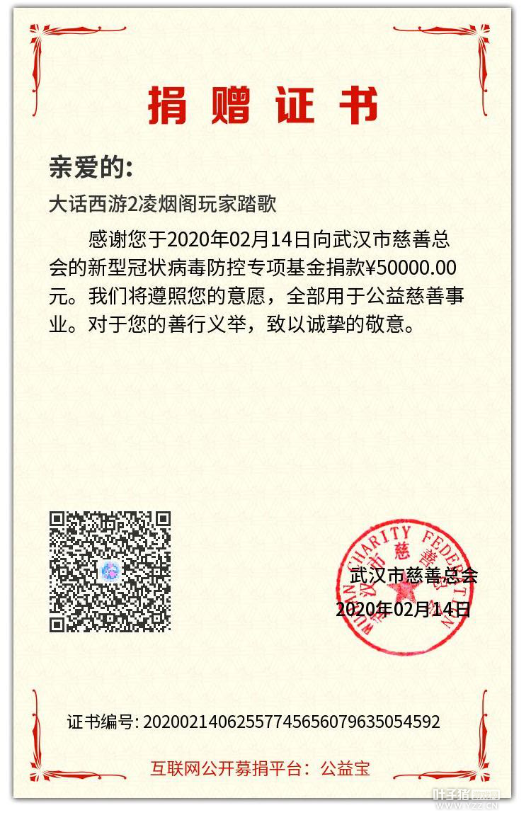 Q: 5万对于普通的大话玩家来说,已经是一笔不菲的金额。请问是什么信念驱动你的这个善举呢? A:首先我是十几年的大话西游2玩家,我又是一名CC主播。通过CC直播大话,获得了一批喜爱我的粉丝,此次捐款我不仅代表我个人,也代表着支持我的粉丝,我们共同来捐赠这笔款项,希望我们能为防控疫情出一份力,我相信疫情无情人有情,我们能战胜疫情。 捐赠证书