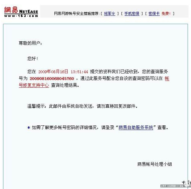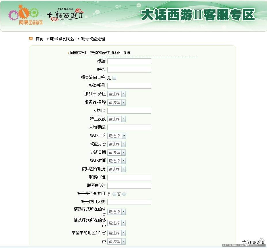 一直以为,自从加入了记者站。在与同事平常的探讨中,在被盗者的交流中,天天耳濡目染,也应当学到不少防盗知识。可是,就在七周年庆的当天,我的号被盗了。 一直很小心的保护它,一直认为做到几乎尽善尽美了。但是当密码输入N次仍无法登录之时,我明白,我需要学习的还很多。 不过,被盗之后的当务之急是怎样最大限度的弥补损失。在一番努力后,用了近24小时,号终于拿了回来。 我想用一个时间表来叙述这24小时的分分秒秒…… 8月15日 早8.30-12.00: 由于家中断电,去一家网吧驯养动物升职业技能。(昨夜已将周年任务完成) 下午1.00-5.00: 在家中继续驯养,5点下线 7.30: 准备登录游戏帮战时,发现密码被更改 7.33: 准备安全码修改密码时,发现原先绑定的密保卡被更改 7:38: 用安全玛将恶意绑定的电子密保卡解绑,并提交申请冻结账号 7:42: 由于将帐号冻结,无法用安全码更改密码:( 10:02: 在帐号修复中心(mima.163.com)申请,但是因为没有身份证扫描件无法提交 一夜未眠~~忐忑不安(账号找不回着急啊) 翌日10.30: 在街上一家打字复印店扫描了身份证,并采购将军令一只。 1.52: 在账号修复中心填写相关资料,成功提交 4.50: 我的关联手机收到信息,审核通过 5.02: 立刻更改重新设置账号信息,重新设置密码 5.22: 绑定将军令后登录大话,发现除了加物品锁和时间锁的东西,其他东西都被清空,身上只有一套加锁的装备和几个飞行旗,连摄妖香都被拿走 除此以外,家庭里柜子的东西、管家、镖局的东西除了上锁的以外全部被清干净~~ 因为我将装备和召唤兽加的物品锁及时间锁,所以被盗的损失并不是很大。400W现金、2个遗忘13的炼妖(用12合成的,准备出售故没有加锁) 1车9血、法、天书、星梦石、神之石、高级石头、高级炼妖、2.3级不可培养配饰等等。 此外,4只召唤兽与6级可培养面具的时间锁已经申请解除,正在倒计时…… 5.30: 本来打算申请找回一些东西的,但是由于被盗物品数量过多,且价值很低,所以没有申请找回。 这时,与我被盗时刚好过了24个小时。 虽然号最终找回来了并且损失不太严重,但是我依旧心有余悸。我以前是将电子密保卡存在QQ硬盘上的,没有想到,我认为已经万无一失的防范却变得不堪一击。此外,在游戏或论坛中,有玩家反映被盗号,我们也只提醒他来客服中心来提交,但是有些玩家平时不上论坛,来到客服中心后也只感到一头雾水~~无法及时准确的提供信息,从而避免自己的损失。 唠叨了这么多,就是希望从这次被盗中能吸取些经验带给大家。古语有言,亡羊补牢,为时不晚,今天我将账号被盗后找回账号需要注意的地方作以总结,希望能够对玩家起到微薄之力。 一、盗号者只转移了物品,没有更改密码及恶意绑定新的密保。玩家能够上线。 在上号时,你惊奇的发现上次上号的IP不是你所熟悉的,而且你的物品也少了不少。这时候,你应当这样做: 1.使用杀毒软件杀毒(在网吧玩的朋友们跳过不看;在家上网的玩家估计电脑已经中马了,还是先杀毒为好) 2.来到大话II客服中心(xy2.gm.163.com),使用游戏账号密码登录 3.在“账号修复问题-解除账号密保产品”这里选择解除您所绑定的密报产品。(对方既然能上你的号,自然你的密保产品也了如指掌,所以先要进行密保更换) 4.选择解除种类后,显示以什么方法解除(我以解除密保卡为例进行说明) 这里选项众多,但是密保卡没有更换的玩家就可以利用老密保卡的信息将密保卡解除掉。 5.成功解除密保后,需要更改密码了 在“账号修复问题-修改账号资料”中选择“修改密码” 6.点击进去之后,也是可以用多种方法修改密码的 在这里,因为密码没有被盗号者更改,所以在杀毒之后可以直接选择用老密码更改为新密码 7.更改完毕后,需要做的就是增加绑定新的密保 在首页点击“密报产品问题”后,可以选择增加哪种密保(个人推荐将军令) 8. 点击进入“将军令问题”或“密保卡绑定问题”后可以选择增加绑定。 需要注意的是,每个账号只可以绑定一种密保产品,准备绑定的账号不能绑定任何密保产品。 9.取回被盗物品 在首页的“账号修复问题”-“账号被盗处理”里面,选择“被盗物品快速取回通道”(要确认账号已经取回) 10.之后,先要确认一份“被盗虚拟物品申报找回协议” 11. 填写被盗物品取回的表格,在填写被盗物品时记得要填写的尽量详细 填写成功后,需要等待工作人员的审核。审核结束后,在游戏中系统会发信件给你,之后可以到化生寺“步长大师”这里拿走找回的物品。 总结一下:没有更改密码及密保的情况下步骤是这样的:杀毒→解绑原密保→更改密码→绑定新密保→物品找回。 在楼下,我将介绍在密保卡及密码都被更改的情况下如何找回账号的。 二. 盗号者更改密码并恶意绑定新的密保,玩家无法上线 很多时候,盗号者觊觎你号上比较有价值的物品,成功盗号之后他更改了你的密码及恶意绑定新的密保(一般盗号者选择绑定电子密保卡,因为它的成本最低)。然后将用时间锁锁定的物品申请解除,待到时间解除之后便可以倒卖出售。小记遇到的就是这种情况。 1.当发现密码被更改时,用其他号登录游戏,看你的人物是否在线。 2.锁定账号及强制人物下线 如果你的账号没有在线,就到客服专区主页中的“账号修复问题”里点击“锁定账号”,因为盗号者随时会回来继续盗号。 如果你发现你的账号仍然在线时,选择“