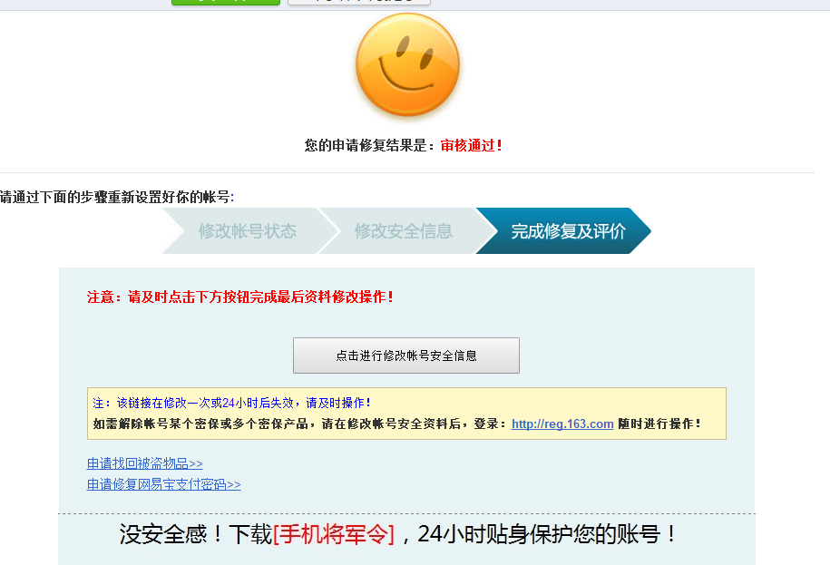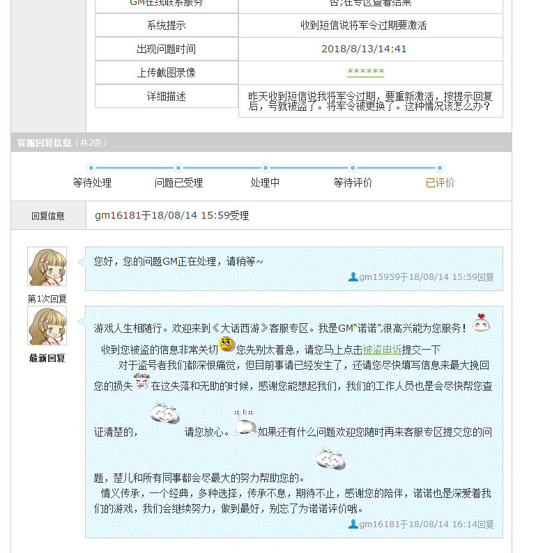 大家好!我是天若有情的战且试天下,最近微信上好多大话2玩家向我反映,收到短信说将军令过期或需要升级的短信是怎么回事,我都劝他们赶快改密码,不要回复。 >>>推荐阅读:一周囧图:一周囧图:一周囧图:大保健生死瞬间 胖宠模仿咒怨 前几个月,有一位老板也收到这样的短信,于是按他提示回复了,他以为没事,刚好他忙事业上的事情,一直没上号查看。后面才发现两个号都被寄售成功了。找客服处理说只有报警处理。后面他经过朋友介绍才找我帮忙处理,我也无能为力。从那开始,我经常在叶子猪微信群里发群公告提醒大家不要上当,但毕竟叶子猪微信群只有6个范围太小。 今天又有一位玩家向我反映,也是因为手机收到短信说将军令过期了,然后要求他发短信和回短信。然后将军令就被替换了。号就自然上不去了。由于他没经历过这些,现在不知道要怎么处理,经过朋友介绍找我帮他找回。详见下图: 由于他的号说是朋友送他玩的,于是我想先通过客服平台找回试一下,于是打开http://xy2.gm.163.com,里面申诉。部分玩家如果找不到申诉入口或返回说账号无异常的。可以通过这个网址综合问题申诉最快捷了,这个网址是我帮好多玩家申诉账号客服发给我的 http://xy2.gm.163.com/submit_sub.html?stypeid=2337 申诉完后,客服的答复是叫我先改密码,可是将军令被替换了,无法更改密码。如下图: 于是我叫他联系他朋友,叫他朋友提供身份证正面和反面,还有绑定游戏号的手机号,还有原来绑定号的QQ号,什么时候在哪申请的号,经常在哪上,哪个区的,ID(如果ID不记得,可以通过小号或朋友号上查看,或者查看游戏目录下的截图文件查看ID,或者打开网易邮箱里面也有个截图包的可以查看或者手机版藏宝阁可以查看以前卖东西的单子可以查看或者登陆客服平台查看以前提交的提单也可以查看),解锁码,号上装备或宠的情况。 于是我赶快打开账号修复的网站mima.163.com,根据提示,叫他朋友手机发短信验证,然后提交身份证正反面,提交被骗情况,提交游戏号的相关信息。要求解除将军。更换手机号,如果是自己的手机号不用更换。提交完后等客服处理如下图: 大约过了半小时,我再查询的时候,发现已经提示审核通过了。于是赶紧联系他,叫他配合修改密码和手机,还有解除骗子将军,详见下面几个图: 骗子将军令被解除了,然后叫他绑定自己将军令,然后叫他上号检查东西丢了多少。如果有东西丢了,打开xy2.gm.163.com提交被盗物品找回。 大话上潜伏太多骗子,大家要小心,各式各样的骗术五花八门。不要轻易相信别人,不要轻易让别人上号。不要随便转账给别人。还有好多骗子冒充别人微信行骗的。我是深受其害,经常有人改成我的微信头像和名字去骗人,坏我名声,凡是找我的请认准微信号。我以前也发表过一些关于账号安全相关的,可以点击下面网址查看一下。 大话西游2数个血淋淋的案例证明:防骗意识不可无 http://xy2.yzz.cn/security/201803/1328733.shtml 教你如何联系在线GM帮自己和朋友挽回损失 (现在联系在线客服的暗号是反应问题,打开大话精灵,输入反应问题,点在线客服) http://xy2.yzz.cn/guide/201607/1009173.shtml 提高账号安全,提高防骗意识。共建合谐大话。 本人从大话2测试开始玩到现在,也算是骨灰级玩家了,如果您喜欢交流或咨询大话2相关的,可以加我微信zny221005,我拉您进叶子猪微信交流群,期待您的加入,大话2有您更精彩! 最后祝大家玩的开心,多得好东西,祝叶子猪网站越来越好! <<<点击进入大话西游2论坛讨论>>> [编辑:韦小贝]