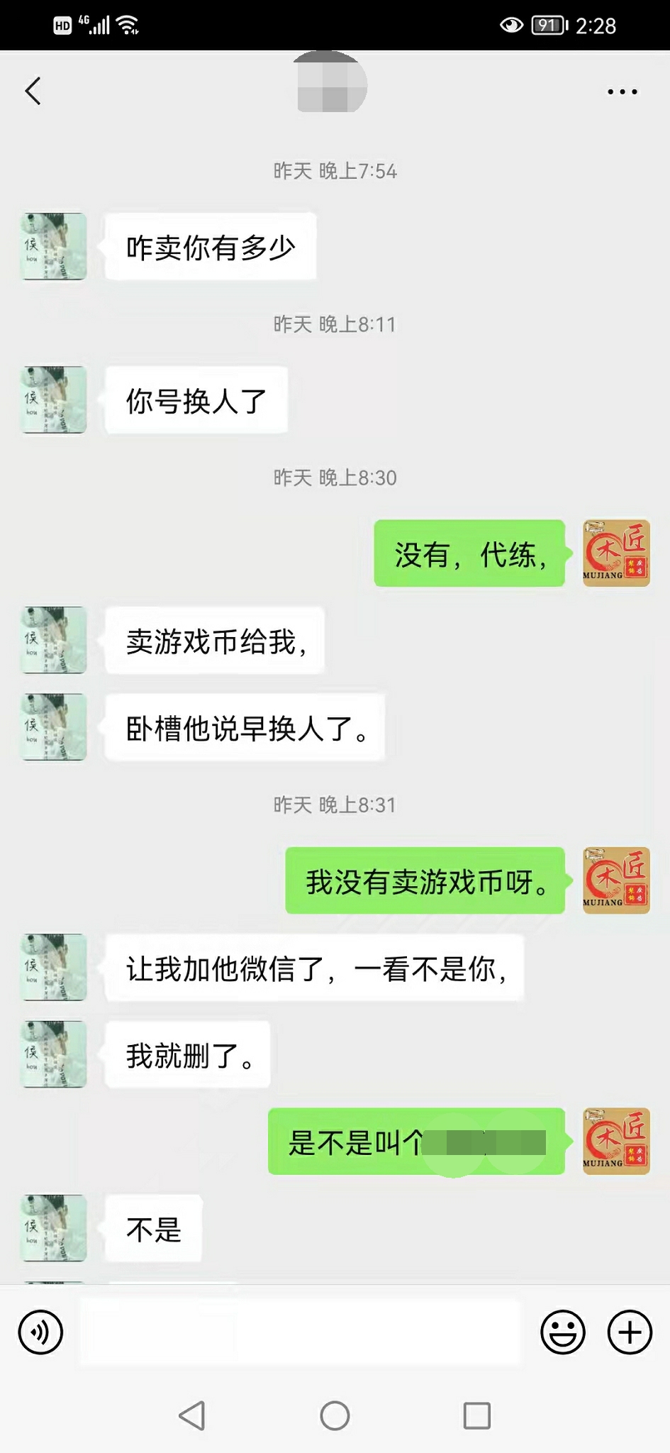 玩家猛然意识到好友问的一句“你号换人了”,这才想起来哪里不对,赶紧语音联系代理,由于代理正在上班,两人打字沟通了这个话题,玩家此刻已经基本确定了事情正如好友说的那样。 玩家跟代理的聊天记录