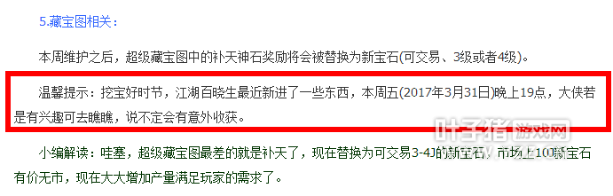 指南录是合成超级藏宝图的必备材料。昨晚有玩家爆料,江湖百晓生处出售指南录,240万/本,相信喜欢挖宝的小伙伴都乐坏了。 不过,大家先别乱猜,如果你对本周四的维护公告有印象,相信就不会大吃一惊。 >>>维护公告:http://xy2.yzz.cn/focus/maintenance/201703/1092204.shtml 维护公告提到,昨晚的7点,百晓生处会有意外收获,也就是限时出售的指南录。 不过小编也总是后知后觉的,登录游戏时百晓生已经回复了原来的模样... 对于喜欢挖超级宝图的小伙伴来说,这无疑是一大福音。尤其是3-4级可交易宝石取代补天,无疑是将奖励提高了一个层次。 同时,表哥可能是跟商人开了一个小小的愚人节玩笑——平时我们服务器的指南录卖280到360不等,都是略高于售卖的价格。这算不算表哥的节日福利?不禁惋惜啊,错过了一个商机... 最后祝大家愚人节快乐! <<<点击进入大话西游2论坛讨论>>> [编辑:wei]