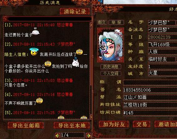 如今好的队长可说很是难找,很多任务带队的人都开口要收费才能上车,一些辛辛苦苦无私带队的队长,只求得到的盒子属于自己就好,这一点无可厚非。 而一旦沾上了有人抢盒子的事,就很容易发生冲突,来自山西的这两位,就因为盒子的事产生了口角: [编辑:韦小贝]