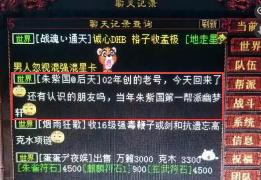一位超级老玩家在世界喊话,道出了自己找回15年前账号的经过... >>>推荐阅读:一周囧图:一周囧图:石头蛋蛋也逃跑 化无龙马见笑 原因竟是...不知是回忆还是幸福感呢: 看到这样的喊话,一看就是有故事的人啊!