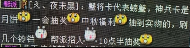 大家好,我是来自鹤舞云天服务器天下无忧帮派的成员!这不眼下就快到中秋节了吗?我们帮主就在赏功堂里放置了一些蟹将卡和神兵卡作为中秋的福利准备送给大家!那么抽中蟹将卡的是送螃蟹,抽中神兵卡的则是送月饼,平常都是羡慕别人的帮,这次终于轮到我们帮了,在这里也感谢下帮主的福利,也顺便道一声您辛苦了! 小伙们,你收到帮主的福利了吗? [编辑:期许]