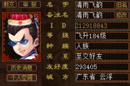 我选择了天下无双服务器,也就是现在的春暖花开。当时游戏里比较兴家族名,最初清雨XX这个名头,也是我山西那个大哥要求起的,最多时现实十几个朋友一起玩一起加入,我改成清雨飞韵时,大哥还说送个守护给我,把另几个妒忌死了。 大话的江湖情义或许是在从游戏认识的朋友再到发展成为现实的好朋友开始,我没收这个大哥的守护,要了他一个三转黄金,当时黄金兽价值400块哦。