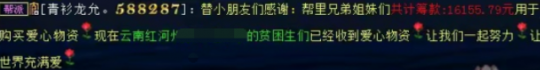 蓬荜生辉帮派气氛一直很活跃,得知青衫龙允资助小朋友的事,就有帮派朋友提议可以组织一次爱心活动,大家也响应的特别积极。因此他们以大话西游2蓬荜生辉帮派的名义联系了马老师,在购买物资时由于交通问题,青衫龙允又自掏腰包才让物资顺利抵达小学。