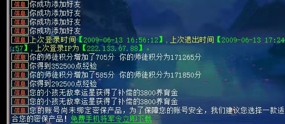 那是个纯粹的年代,纯粹到以现在的眼光来看是那么地不真实...... 没有高级装备的对比,全队清一色的黄金兽,只能对比下谁的黄金兽比较帅(其实一个模样);经常性的拉起整个队伍去某个自认为很美的地方拍照,然后被兄弟们一顿嘲讽,说是错过了妖王;大话表情玩得飞起,比如#24代表惊呆,也有看“傻子”的意思,比如#35是无所谓,给兄弟连续发#35就会被骂不用心;从没觉得奖励拉胯,因为根本就不在乎得什么东西,不过队友得了好东西跟我们炫耀的时候,还是会被各种嘲讽。 本以为这些都是过去的事情了,直到某一天我找回了曾经的老号,点开闪动的好友消息,看着结拜兄弟发来的消息,我有点发楞!最后一条消息的时间定格在了2009年6月25日。我随手回复了一句“我号找回来了”。点开队伍老四发来的消息,控诉着我们对他的冷漠(其实号都被盗了),我呆呆的看着白色的好友栏,思绪回到了当年我们五人结拜的时候。 以落雪无痕ぃ为名字前缀,大哥名字后缀是“殇”,二哥是“龙”,我是老三,后缀是“羽”,四弟是“飘”,老五是“冰”。老五和我到现在还有联系,我们俩都是打工仔;大哥当年自己在唐山开的理发店;二哥是一位学美术的大学生;四弟家里是做生意的,说话也最冲。 结拜兄弟老四发来的消息,看了心疼