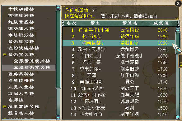 后来合区,服务器一下子热闹了起来,有人开始往我们服务器移民。我看准了这个时机,开始努力为清若胜水招人。只要看到系统提示有人来了,我就私聊他,拉他加入我们帮派。 我们小帮派,其实发展挺难的,但是我相信,只要我勤快点,总有愿意一起发展的玩家,我就用这样的方式,大概前前后后用了两个月左右的时间,拉了不少的兄弟姐妹过来,所以帮派在整体实力上也还算不错。