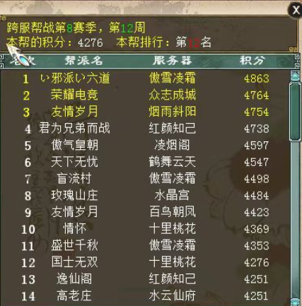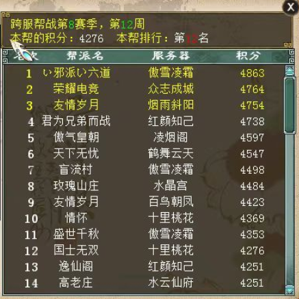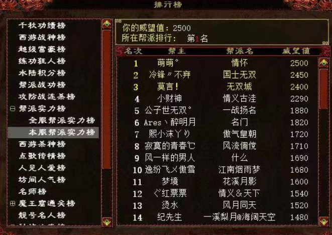 轰轰烈烈发展 铸就帮派辉煌 我们这个帮派发展时间很短,也就两年左右,是兄弟和朋友一起建立的。之前在十里桃花服务器一直排名前三,我本人是从风华正茂服务器开始就当帮主的,后来移民过来,朋友和兄弟互相舍不得,也就跟着都过来了。来这边以后,又认识了张鑫帮主,我就把帮派又接手过来,继续带着风华的兄弟和朋友一起玩,大家在一起玩得开心,任务啥的也有个照应。