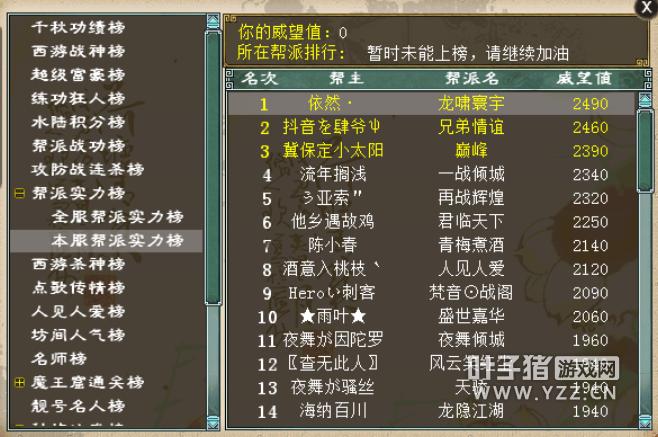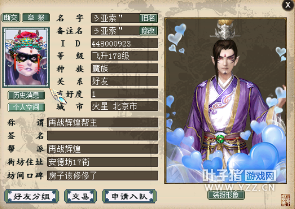飞花逐月服务器再战辉煌帮主:ぅ亚索" 很多人相忘于江湖 我有八个兄弟相伴至今 大家好,我是再战辉煌帮主ぅ亚索",从2002年接触大话至今,我一直用着亚索这个名字,从未改过名字。2009年,我在踏雪寻芳服务器结识的几个好友想玩新区,重新体验一把冲级激情,大家组团进驻新服,没想到这一玩就直到现在了,也就是现在的飞花逐月服务器。 这些年,我们队伍虽然分分合合,队友有的忙于事业,有的已经移民,一直没有分开过的还有八个好友,我们一路在岁月流逝中相伴相扶。游戏有兄弟才能有酒有故事,才能延续我的大话之路。 两年前再战辉煌前前任帮主因现实忙碌把帮派给了我的徒弟,徒弟维持不起帮派就把这个重任交给了我。当时帮派一直在乙级徘徊,初接任帮主之位的我有点小紧张,无管理经验,一切都在摸索阶段。