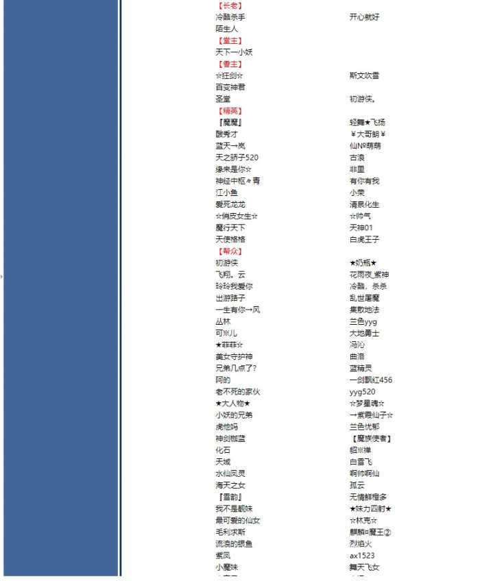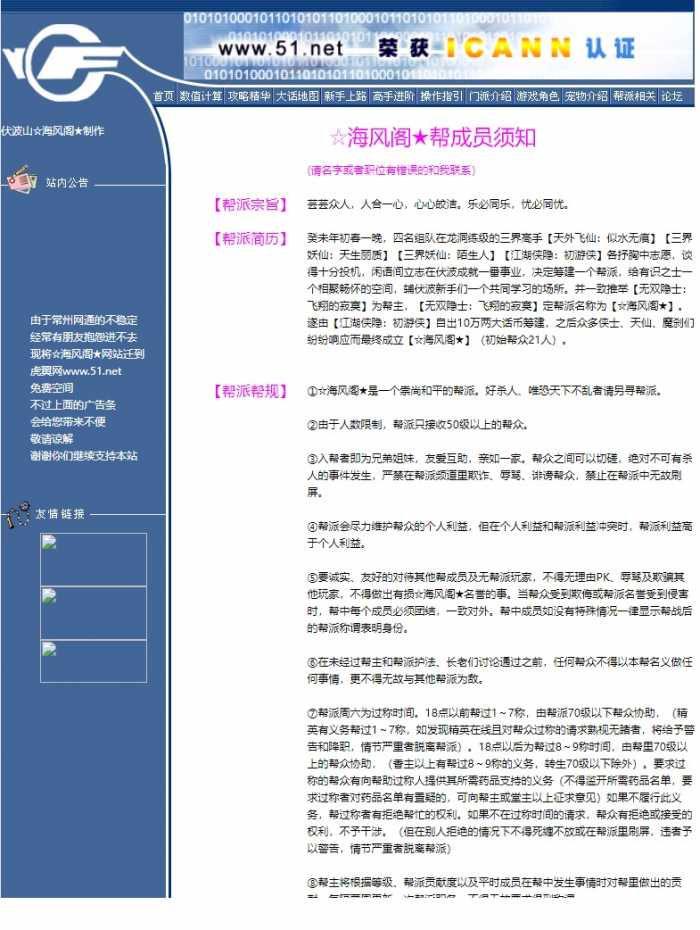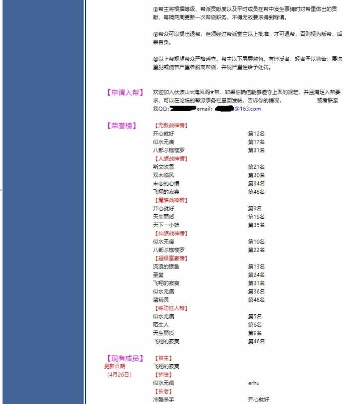 近日,一位玩家在整理旧物品时,发现了一个旧的机械硬盘,打开一看,竟然发现了曾经做的帮派免费网站的源代码,里面完整还原了当时的帮派记录,不知这是不是大话西游2目前能找到的、最早的一份帮派记录了? 下面就请看这位骨灰级老玩家的自述吧: 从硬盘中的内容来看,这是在2003年4月26日的记录,发生在曾经的伏波山服务器“☆海风阁★”帮,也就是我当年坐在的帮派,之后这个帮派和“最领域”竞争激烈,并最终成为伏波山第一大帮! 而记录中的“☆海风阁★”,仅仅是处于初期阶段,还没达到顶级帮派,当时的帮主是“飞翔的寂寞”,而我当时估计还没一转吧,只是帮里实力较弱的活跃分子,当时入帮条件是未转50级就能进,还以帮忙过称作为吸引的条件。 更令人惊讶的是,上面竟然还记录了帮派建立的背景,都忘了这是谁制作的了...... 从这份记录之后,我开始了疯狂冲级的节奏,并最终成为了海风阁的帮主,当在叶子猪上也是一个小有名气的血攻魔! 在第二届服务器联赛时,我们和“最领域”的队伍一起合作打进联赛四强,但那届联赛后我就基本淡出了。现在回想起来,记忆最深的就是和“最领域”竞争的日子,以我、狐狸、李嘉诚、风云、欣芯组成的血队,和hata、老鼠、泉、天使、洞洞的敏队每周帮战PK,各种配合研究,并在二联打败了级别绝对领先的桃花涧,此刻想起这些,我整个人还是很兴奋! 时间飞逝,往事只待追忆,若是你曾在伏波山,曾在“☆海风阁★”帮派,或许就能从这份记录中,找到你曾经的玩伴,甚至你自己的名字! [编辑:xkoelka]