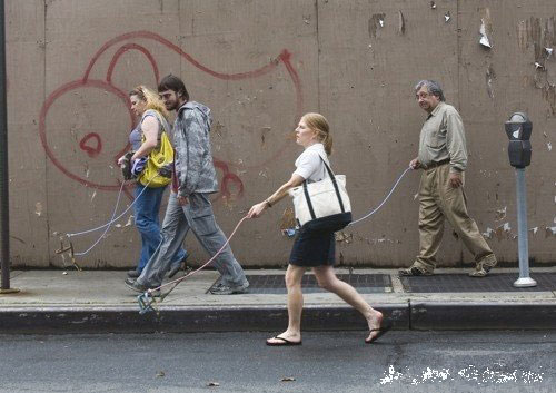 闲得蛋疼的资本主义疯子们,同样是来自Improv Everywhere 组织的古怪行为艺术。看不见的狗,如图,就是 这样牵着一坨未知生物去街上遛弯。