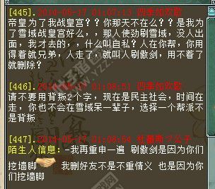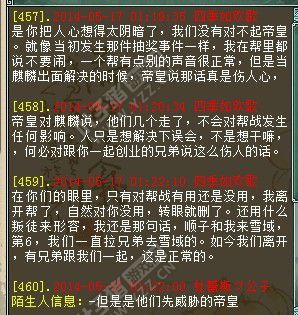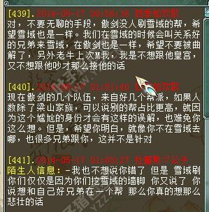 我是4年区龙的传人的玩家,在这发个帖子发发牢骚,讲些不太愉快的事,希望事情有个好的结束。在祝愿大家生活越快,游戏开心。 近期,雪域的朱雀、id001等人接二连三的刷傲剑帮派,这是为什么呢,为什么呢? 话说在大约7-8个月前,顺子带着四季去雪域一起发展,当时雪域在龙的传人的综合排名还在第6,顺子的梁山家族有将近20来号人,四季也有不少兄弟,全都拉来了雪域,逢帮战必上线,四季一直也在挑战队伍出力,在大家共同努力下帮派发展到了全区综合排名第二,顺子也在雪域担任副帮主,四季左护法,原本也一团和气。后来在一次因为一次抽奖活动,引发了敌对情绪。当日抽奖活动按惯例是每人一次机会,一共一车24物品,顺子贡献了2个毁梦等贵重物资,在大家都抽完奖后,突然有了第二轮抽奖,这其中有1个5级垃圾符石。大家都已经抽完了唯一的次数,但帮里还有几个号还没用完唯一的抽奖机会,抽走了符石。于是有梁山家族的人就问为什么会安排2次抽奖不被告知,为什么贵重物资在第二轮没人会知道,当时也有人附和帮派吵吵的比较多,帮里主管要求不再对此事吵闹。后来有2个梁山家族的人比较极端,认为帮主帝皇不坦诚,就离帮了。 之后,大家都以为兄弟情义,这事小事就没在意,让梁山家族的去沟通下,把误会解除,麒麟去找帮主帝皇去谈这个事,帝皇说他们离帮对帮战不会有任何影响,类似的话说了一些就对创业的兄弟情义完全不顾。梁山家族经考虑换帮去个小帮自己搞。之后就顺子、四季、还有蛋疼队伍都陆续离开了雪域。当然因为有些本来去雪域就冲着这三组人马的也陆续的来到了傲剑。 傲剑之前一再对雪域忍让,是因为在雪域还有昔日的兄弟,不想2个帮派太僵,让他们不好做,但似乎雪域的帮主就主动一再鼓动个别人去闹事,好让2个帮成对立,用外部矛盾刺激内部和谐,破坏傲剑名声,另外有人离帮也不方便去傲剑。之所以发这篇文,一来想说,帝皇,你再这样鼓动个把走狗刷傲剑,我不会再忍让,更重要的是想对仍在雪域的兄弟说,不管在哪里,我们永远是兄弟! [编辑:紫幻冰子]