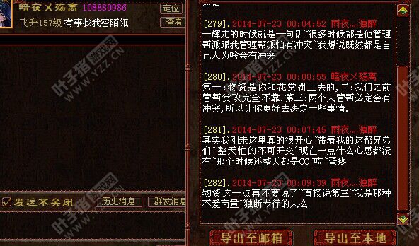 注:以下内容为玩家爆料,并不代表与叶子猪认同其观点,也不代表叶子猪编辑支持其观点,只为大家茶余饭后徒增话题罢了! >>推荐阅读:突发资讯:玩家爆料石头蛋蛋疑似因故清号 百鸟朝凤的兄弟们,在醉卧红尘的人都知道,自从我们进醉卧以后发生的变化,醉卧一直在进步。 临到最后暗夜离殇看帮派稳定了,用卑鄙的手段栽赃陷害说我当了帮主乱杀人,乱踢人,到处给不明真相的兄弟捏造谎话污蔑我,玷污的我的人品。 我独醉走哪里都是坦荡荡,没想到我跟我的好兄弟雨夜灬花无道给帮里一多月花了几十亿,跟大伙一起努力从排名第五打到排名第三的醉卧红尘帮派就这样断送在了暗夜离殇的手里。 最可悲的是我耿直的把帮主给了你,你却猥琐的到处给我造谣,是什么样的人。是怎么样的鬼,大家看了自然会明白。 以下是聊天记录: <<<点击进入大话西游2论坛讨论>>> [编辑:小雨]