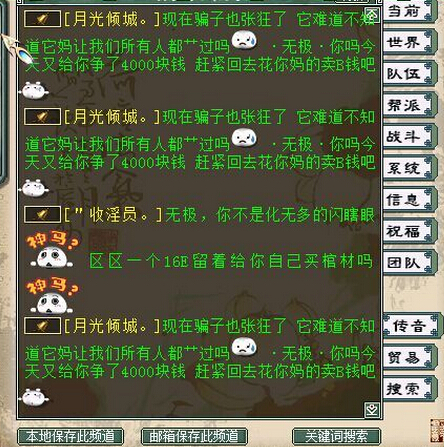 龙御之巅前帮主‘无极’和自己小号'此生逆天'在古城开大玩法输了16E,小号在赌,大号做抵押,给我看了化无.六阶套什么的,然后输掉了直接下线走人... 在漫长的一个多礼拜,此人以不是本人为理由,一直赖账,下面我就将事情的经过给大家看看,希望大家可以留意这种不道德的行为! PS:温馨提醒,赌博非法,切勿参与,切勿模仿! <<<点击进入大话西游2论坛讨论>>> [编辑:韦小贝]