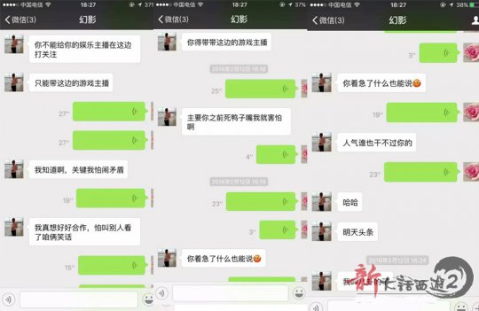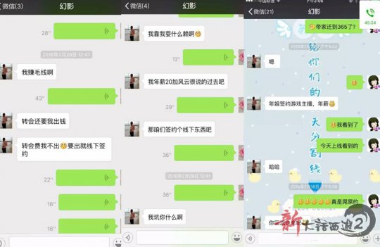 年姐亲述:幻影骗人始末;你赢在了网络,但你也输掉了自尊! 前言:我为什么会和幻影有合作的可能? 玩CC的应该都知道,我跟幻影之前的恩怨,对立很长时间,但是俗话说的好,冤家宜解不宜结,在时间的冲淡下,还是和解了。我以为他已经改过自新,好好做公会了,所以之前的敌人变成了朋友。正因为这样,也就有了本次事件的开始。 起因:回归大话后,因为要开游戏直播,幻影也邀请,就开始合作。 幻影搞了一个365公会,然后来找我跟他合作,说想借着我的人气帮他把公会搞起来,然后承诺给我转会费20万,年薪20万风云冠军等,让我的游戏后台签约他的公会一年,因为刚回归大话,我想着在哪里直播游戏也一样,既然跟他也已经冰释前嫌,可以考虑合作下。然后我就答应了他的请求。 重点:关于合同的问题,一切都谈妥当。(也是后续关键的地方) 当时他还提了下要不要搞个合同,我说不用,我一个1130的公会老大,我跟你弄什么合同,又不是娱乐主播,我只负责帮你直播游戏拉人气。如果弄合同,我就不去了,反正我也不差你这点钱,没任何意义。最后他说好吧,那你得先签约过来后台一年,我为了表示我的诚意,我就答应了,我说行,那我先跟你签约,帮你过去拉着人气,到月底,你给我转会费,至于什么年薪,什么风云冠军那都是后话,他说行,签约。 履约:做到了答应幻影的所有要求 就这样,我就把自己的后台签约到他的新公会一年,然后过去开始给他拉人气,每天晚上直播游戏帮他拉着几千的人气。当时他还要求我,不能给自己的娱乐主播拉关注,只能给他公会的游戏主播拉关注,帮他带起来几个新主播,我也全部答应了,并且做到了。 赖账:当初谈好的关于合同不签约的事项,却出尔反尔。 就这样到了29号,月底,他也一直没提转会费的事情,我就发了个微信让他转钱!我说咱们账目清好兄弟,一码归一码,先把钱转过来吧,没想到他直接不承认了,矢口否认有这回事,还说我要坑他。我直接无语了。问他几个意思是想耍赖吗?不讲信誉是吗?他直接给我来了一句,要么你跟我签合同,我就给你转会费要么就不给!我就笑了,我说当初我们怎么说好的,如果签合同,我就不跟你合作,我一个老大跟你签什么合同,并且我都过来给你拉了那么多天人气了,你这样做有意思吗?他直接说什么没保障之类的话,找各种借口不给。我说那行,不给转会费,你在我这里失去信誉了,我不跟你合作了,没意思。 缘由:遵循CC的转会规则,却被幻影拿现实的合同来愚弄不明真相的粉丝。 如果当初你就说要合同,我根本不会过来帮你,都快一个月了,现在要给钱了,又要合同,这样做没意思,我瞧不起你。在我知道自己被他骗了以后,很生气,就骂了他。这不是人之常情吗?我不是差那20万,我是感觉自己被耍了,你要弄合同,你早说啊?到了要给转会费又冒出个什么狗屁合同!并且他还反咬我一口,说我想骗他20万没骗到就骂他! 信任:把别人对你的信任,来利用成欺骗别人的资本。 做人就这样,还想搞工会吗?我1130这么大公会在这里放着,我游戏投资百万,我会骗你那20万?并且我都先签约后台一年,先过去播了快一个月,就这样还居然说我骗他!结果就是为了不给钱,现在到处造谣诽谤我,我提供下我跟他的聊天截图!让大家都看清下一个号称土豪OW的嘴脸!没理了就开始骂街,各种扯淡,就闭口不提转会费的事情。大家可以想下,如果没有事前谈好转会费,我会先把我的游戏后台签约到他的公会吗?我又不傻?我选择了相信他,没想到却是这样的结果。想合作,还不肯拿出诚意,呵呵。群众的眼睛是雪亮的,大家自己看截图。我跟那么多OW打过交道,合作都很愉快,从来没遇到这样的OW!信誉全无,还搞公会!太搞笑了! 后续:造谣抹黑,就为掩饰自己欺骗别人的无能行径。 现在他为了给自己找台阶下,整天拿着什么合同说事,因为很多游客并不了解平台的签约系统这些,他就利用了粉丝的无知,来造谣反咬我一口,说我想骗他钱不成,还骂他骗子!我也是醉了,然后还让他的疯狗主播天天在那放我两年前的录音恶搞一些音乐来黑我骂我,因为他没有理,只能天天骂街了。用骂街脏话来掩饰自己的心虚跟无能。搞不起公会就别搞,买不起主播就别买,搞这样骗术有意思吗?以后哪个主播还敢去他那?他现在到处造谣说什么我骗他没合同,说他没保障之类的,我就想问一句,早干嘛了?当时怎么说的?自己打脸吗?自己说的话是放P吗?又想找回自己“打脸哥”的称谓? 结局:一个大男人,奈何行径如此卑劣 今天发出这些截图,就是为了让大家看清楚真相,看清楚他的嘴脸,真不是因为差这点钱,就是感觉被耍了,心里太不爽了。恶心至极,好歹也是个土豪,这样的气度这样的做法,真的让人不齿!希望各种主播以后转公会也要看清楚OW人品再转,否则上当受骗还生气! 居然还有人说我是为了炒作1130才这样黑他,说我1130没人气,我就想说一句,玩CC的有几个不知道1130不知道年姐的,我需要靠他炒作吗?我1130公会自从创立,到2015年底,一年的时间,人气第一,流水第一,收入第一,我需要炒作吗?现在是他开始搞新公会,到底是谁想炒作呢?大家好好想明白吧!身为一个大男人,做事太不够大气,太龌龊了!就这样吧!他整天瞧不起这个人瞧不起那个人,可是被他瞧不起的人公会都做的比他好。整天喊着要干这个干那个,在一个网络平台上,你能干得了谁?人气?公会?还是主播?你拿什么去干别人? 结语感慨:你赢在了网络,但你