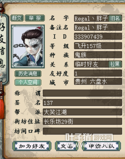 三、对当事人Regal丶胖子的采访: 木兰似雪丶:您好#23我是记者小真#23噢,不好意思,打扰到您了#11我有些事情想跟你了解一下#11 Regal丶胖子:说吧 木兰似雪丶:就是吉吉帮派上次押镖冰怪150回合的那件事情,您作为当事人之一,想跟您了解一点情况。 Regal丶胖子:相信你已经看过那个帖子了,那都是真的。 木兰似雪丶:我看到了,昨天吉吉找到了我,跟我也说了一下事情的经过,我想问一下,就是这个冰怪150回合的朋友,他为什么要选择去冰押镖怪150回合呢! Regal丶胖子:帮战第一场结束,帮派开镖。我在帮派喊组队押镖,内容大概就是 来炮 人带大力宝宝 不带的被踢别找我。 木兰似雪丶:接着呢! Regal丶胖子:押镖开始 第一场战斗 那个男人 带的血剑精灵 而且不操作。战斗结束 我直接T的。 木兰似雪丶:再后来呢? Regal丶胖子:后来他找我 我没理他。第二次镖车开,他自己喊的组队 不知道组没组上。第二次镖车 第一次战斗 他战斗直接大B。 木兰似雪丶:这就是事情的开始,是不? Regal丶胖子:没错 木兰似雪丶:然后吉吉知道后,将这个男人号T出了帮派,但是任务无法取消,吉吉又联系GM,才解决这件事情是不? Regal丶胖子:是 这是前一部分,然后就是我帮派截图开始了。 木兰似雪丶:恩,后续的事情,我也了解过了。吉吉当时不想让事情闹大,直接把旭哥T出了帮派,后续旭哥又回来了,然后您就离帮了,对不对啊! Regal丶胖子:你可以尝试加一下我发帮派截图里面的那些人 还有叫什么兰蓝的。 木兰似雪丶:您的截图内容我看过了,也了解了事情的内容。我想问一下您,您在这个帮多久了啊! Regal丶胖子:我主号一年多,这个号是刚移民过来的。我在帮派很活跃 大家都知道我。 木兰似雪丶:如果没有发生这件事情,您对这个帮的第一感觉是什么呢? Regal丶胖子:如果没有这个事 感觉还不错的 但是帮主的做法 让我现在很恶心。 木兰似雪丶:这个感觉还不错,能说的详细一点吗? Regal丶胖子:我这个人不求什么 安安稳稳的心态 如果不出什么事的话 我号估计能老死里面。我个人对帮派不怎么感冒 不喜欢今天这里 明天那里的生活。 木兰似雪丶:那小真我可不可以理解为,您对这个帮派的感情还是非常深的? Regal丶胖子:深谈不上。只是以前喜欢冷心他们的直播 那样逗比。 木兰似雪丶:那现在你离开这个帮派,在新的帮派里,有什么新的体验吗? Regal丶胖子:这边有我的朋友 一样可以各种吹牛逼 而且没有人装B。 木兰似雪丶:说真的,我昨天对这件事情了解的非常多。 Regal丶胖子:那你可以说说你的看法 木兰似雪丶:吉吉出于对帮派的管理,而旭哥也是这个帮的老人,你们之间的矛盾是因为押镖引发的。而旭哥他也是个火爆脾气,那天因为也喝了点酒,所以说话,没有多去考虑,后续才知道对帮派的影响有多大!对于这些种种,每个人的出发点都是不一样的,冰150回合的男人耍了小性子。没有顾全大家。你则是事前说明的很清楚,但是他耽误到了你的时间,后续也耽误了大家的时间。本来就有气,后来他又冰怪150回合,气上加气。然后在加上旭哥帮里跟你的对立,导致最后相互之间的矛盾激化更大,然后发生了后续的这些事情!我这样分析,可以吗? Regal丶胖子:这不是气 这是人品。旭哥那个就是倚老卖老 来装的。 木兰似雪丶:我明白了!很高兴您能接受我的采访#23 Regal丶胖子:做为一个3年的老人 能不站在帮派角度考虑事情#55 木兰似雪丶:他昨天晚上,我跟他聊过后,他给全帮的人道歉了。 Regal丶胖子:这就完了?说难听点 是不是 我杀了人 然后道个歉就算完了? 木兰似雪丶:我的采访结束了,我只是想真实的还原这件事情,至于谁的对还是谁的错,小真是旁观者,就不多下定义了#23 Regal丶胖子对帮派人道歉了 那当事人呢#55 木兰似雪丶:都没有错,也都有错。您还有什么要跟我补充的吗? Regal丶胖子:补充就是,道歉有用的话 还要原则干嘛?他和人是兄弟 别人就不是了?这不是过河拆桥 这是什么?最后一句话 天在做 人在看 自己做了就要负责。 木兰似雪丶:谢谢你接受我的采访#23