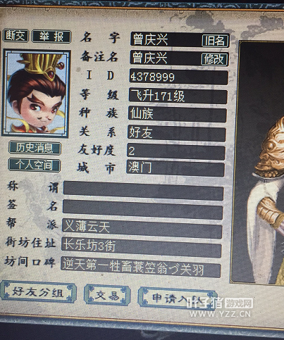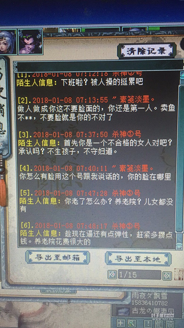 后来女神帮的开始偷袭他们,″素笺淡墨。的帮派也加入了。 记者莎草子:杀到现在? ″素笺淡墨。:嗯,这个杀神3号从我们两个帮杀开始就一直偷袭我帮人了,杀了三个星期,他帮人掉到乙级了,现在杀人成本大你也知道,我们偷袭的时候,我都是告诉帮里人队里带男人,不要误杀别的帮。现在他们想了一个,又省钱,又不坐牢,杀伤力还大的偷袭方式,就是一个人点一个任务队,哪怕队里只有一个我帮的人,不管其他四个人的死活,这个人,装备也下了,就带几个不掉耐久的加敏的装备,法打空,进入战斗直接叫孟级,同归于尽不坐牢,你觉得游戏里这样公平吗? 记者莎草子:嗯,理解你的,碰上这样的杀人是很头疼的事情。 ″素笺淡墨。:他们跟我帮有仇可以点我帮人,到处乱杀,官方都不管吗?这难道不叫恶意PK啊?他们不用修装备,不坐牢,这样太不公平,这可以说是钻空子。最恶心的他们这么做还不以为耻,有的时候,我帮的人没死,其他帮的死了四个,这样下去,我们区会变成什么,不敢想象,他们单个偷袭的号,有五六个,全部带孟级,我们为了这次战争买了多少组杀人香,哪怕点队里的一个,也是五个人一起去。 记者莎草子:感觉不应该只是2个人的矛盾导致以后长时间的对付你帮,想想是不是还有别的矛盾啊? ″素笺淡墨。:当时跟关羽有仇的人除了龙站流氓,还有个叫老梦,曾庆幸,三个人,后来这三个人纠集了几个他们的朋友,一起偷袭我们,再后来,他们的人也自己慢慢停止了,老梦移民了,就剩下龙站流氓和曾庆兴 这是另一个与关羽有过节的玩家资料
