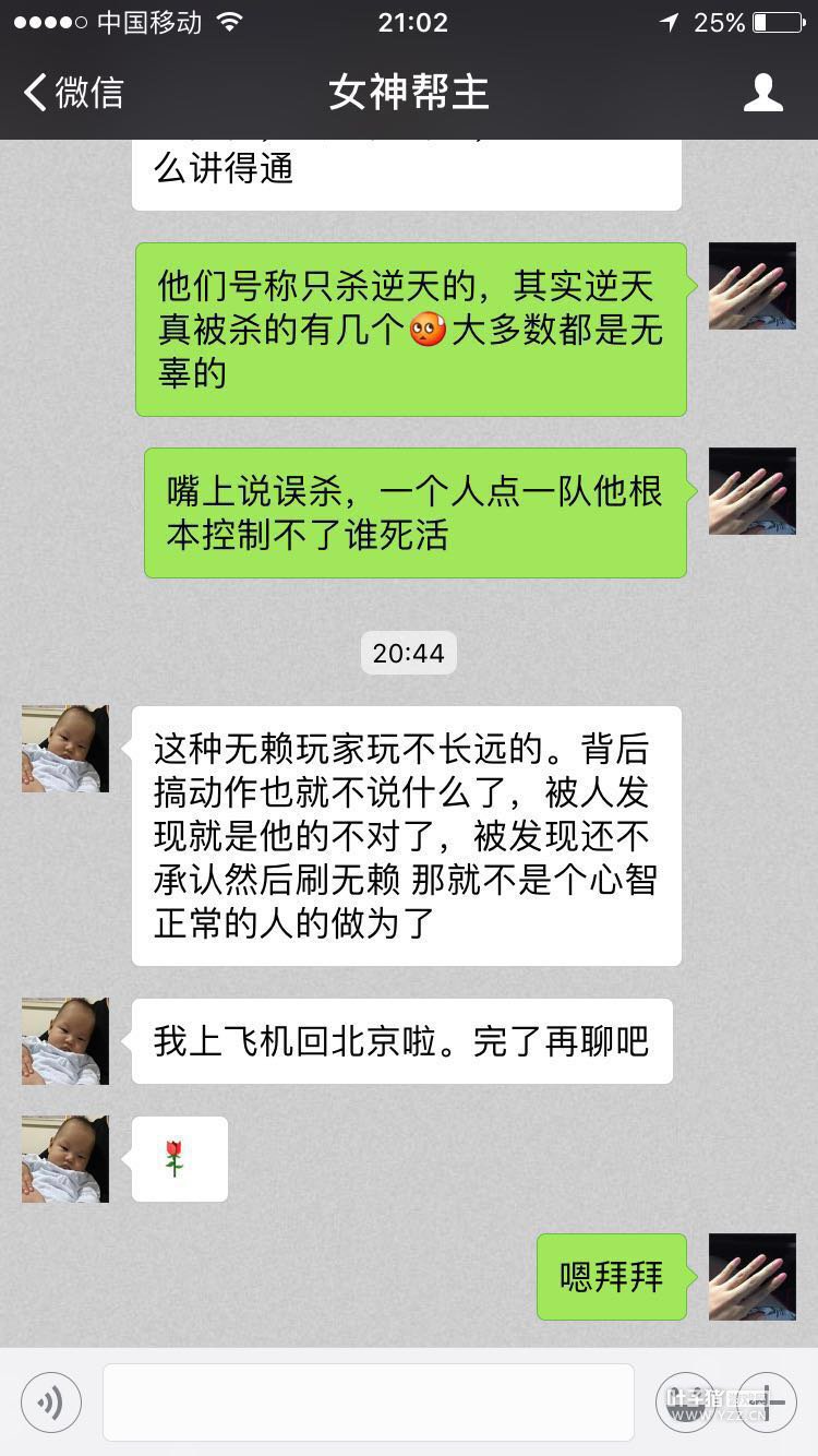 记者莎草子:你好,是帮主本人吗? 阿文思雪。:是 莎草子:你好,我是记者莎草子~逆天帮邀请我过来做个采访,牵涉到你的帮派,所以想跟你也聊聊,可以吗? 阿文思雪。:可以。 记者莎草子:帮主聪明人,应该知道采访的是什么,区里也有很多人抱怨被你帮的人无辜点杀,是有这个事情吗? 阿文思雪。:没有人抱怨逆天乱杀无辜吗?你去看看杀人榜谁是第一?他们帮第一帮派。只要第二帮派威胁到他们第一的位置就找茬偷袭。 记者莎草子:这个无法证明什么,因为事情的杀到今天,杀人榜上也就不好看出具体事情了~那有帮派指出你们自己弄号冒充逆天帮的人杀人,是否有这个事情呢? 阿文思雪。:你是记者? 记者莎草子:是的~ 阿文思雪。:是你妈的记者 记者莎草子:恩怨采访,我是要问到双方的~你可以不信的~但是你会看到这个帖子,报道者也会是此刻我再你们区的这个名字`你可以拒绝我的采访~但是请你注意下言辞~(我说完等了半小时,对方没再回复我) 结束语: 其实记者不知道怎么说这个结束语,昨天在陕西专区做个恩怨报道被玩家骂,结果现在来水云仙府又被骂,玩家的纷争记者也只是如实报道。 [编辑:一笑奈何]