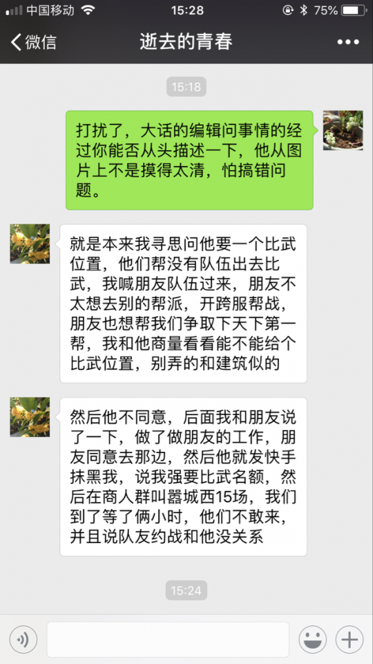 服务器:齐云灵脉 涉及帮派:情聚金宵 红色王朝 事件概述(根据情聚金霄成员描述):情聚金霄本来想向红色王朝要一个比武名额,因为红色王朝帮派没有出去比武的队伍。情聚金霄成员喊了一队朋友队伍过来,只因朋友不想去别的帮派,再一个开了跨服帮战朋友也想帮情聚争取天下第一帮派的荣誉,所以情聚成员和他们商量看能不能给一个比武位置,别最后弄成剑烛沧海的不愉快事件。之后是红色王朝不同意,然后情聚的成员和他的朋友商量了一下,朋友同意去红色王朝帮派。再之后红色王朝就发快手抹黑情聚,说情聚强要比武名额,在商人群约战城西15场,情聚等了2小时,无人出现。 具体的对错是非,留给各位玩家评判,以下是详细截图: