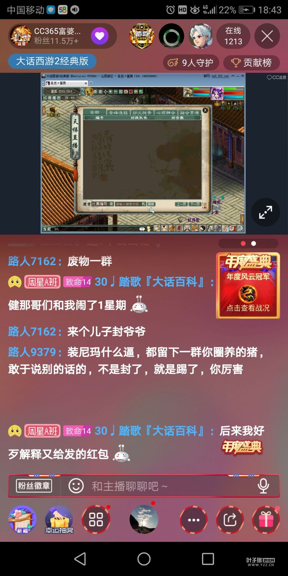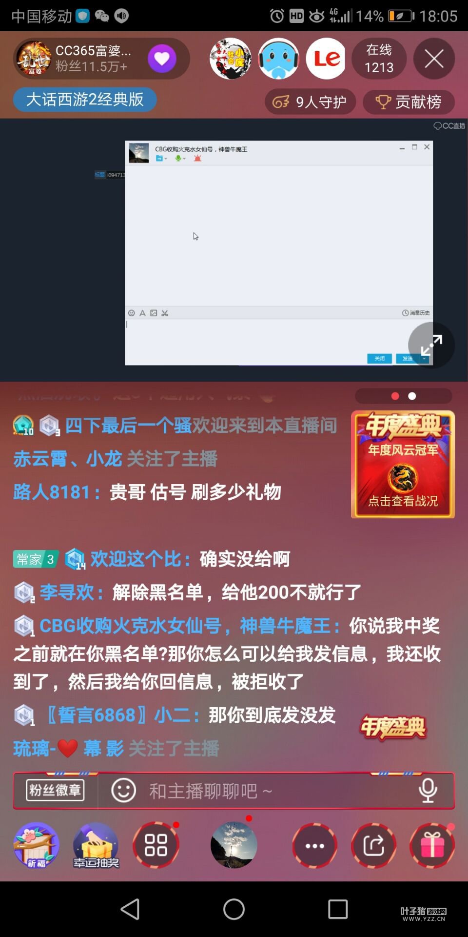 继昨日尘缘未了服务器玩家一切OK投诉看CC主播富婆直播中奖反被当骗子,400红包2被支付10元,他表示还要再联系CC主播富婆说清楚这个事,那么后续如何?该玩家再一次联系了叶子猪。 >>>相关资讯回顾:800元红包变10元?玩家控诉主播富婆骗钱? 以下内容为尘缘未了服务器玩家一切OK提供,不代表叶子猪观点 昨天我找CC主播富婆微信理论,把我骂了一顿,直播间找他理论被禁言直接把我踹了…… 原本想想越气,加上他好友他不理我,下午给我回信了说当时直播间卡了,那个钱不给我了,我也没说多少句,富婆就知道骂我父母,我全程可没说他一句脏话 之后富婆微信直接把我拉黑,到了晚上我去他直播间理论,我说了几个点富婆一个不解释,我说的多了他直接让人给我禁言了。 我换个号去直播间直接给我踹了,全程富婆避重就轻讲些无关紧要的话。在直播间我一说话就封我,很多观众都看不下去了,我第一没说脏话,第二我也没说过分的话,你凭啥封我? 昨天晚上在他直播间被封的玩家得有百十来个,而且昨天晚上他自己开奖不知道怎么回事他又自己整错了,又不想给了获奖玩家,直播间也有玩家说他又想不给钱了 玩家都看不下去了被封了好多号,我不知道官方都不管理吗? 截图:(顺序可能错乱) 说我黑粉,富婆素质真高