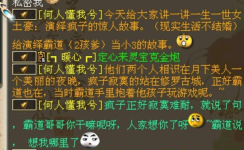 一生一世近来猛料不断,前两天刚刚经过了铃铛撕逼大战,今日又有某主播大肆爆料区内土豪的故事,真是精彩不一般,热闹不一般... 其内容到底真假先不评论,您这份口才,真合适当一个说书的呢~ |