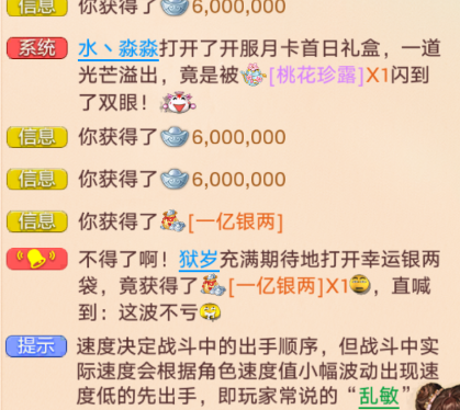大话牛图最新一期内容导读: 1、先出珍品炼化,再挖三级土珠子,今天运气爆棚 2、召唤兽比斗争霸赛海选赛,竟然得到一个二级火五行 3、华山论剑开服五分钟,先挣他一个小目标 4、交易服悟隐身,还得名字好 先出珍品炼化,再挖三级土珠子,今天运气爆棚(晒图人:卡农) 召唤兽比斗争霸赛海选赛,竟然得到一个二级火五行(晒图人:良甜) 华山论剑开服五分钟,先挣他一个小目标(晒图人:晴朗) 交易服悟隐身,还得名字好(分享人:桃落晚晴) 那么,今天你几率了吗?快来评论区聊一聊吧! [编辑:ssc]