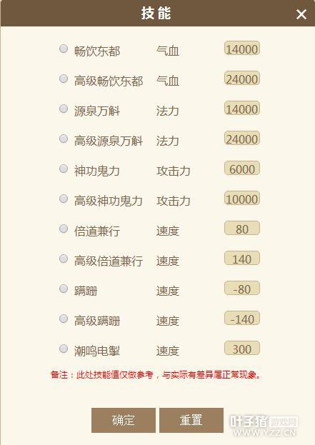 5.选择召唤兽技能:若有需要,可以点击“技能”添加不同类别的召唤兽技能,记得同一类别仅可选择一项哦,不同类别则可以同时选择。此数值仅为参考所用,实际数值会根据亲密度而上下浮动。