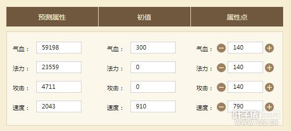 4.召唤兽加点:所有初始值默认为最高值,玩家可以自由更改,然后根据分配点在右侧自由分配到气血、法力、攻击和速度四大属性,输入完毕后即可在左侧“预测属性”处查看最终结果。
