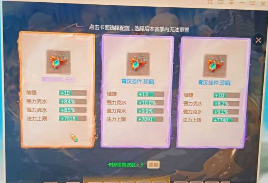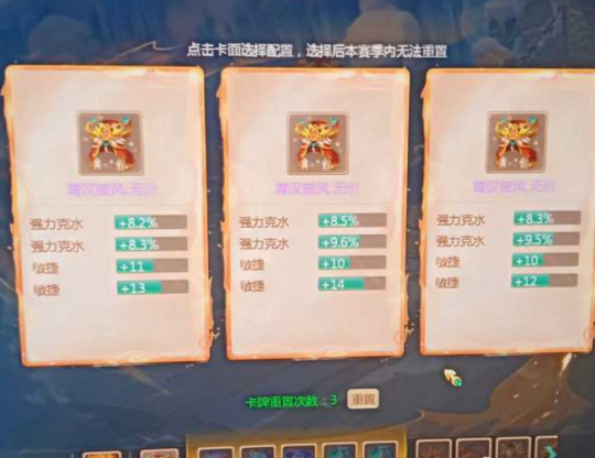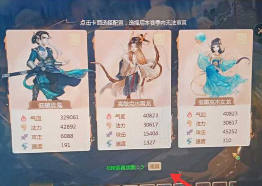 各位大话西游小伙伴们你们好,随着更新和修罗斗技场开放,相信很多小伙伴都很关心关于斗技场的小细节,今天就来给大家介绍介绍。 ![]() 全局出现卡牌重置,次数为三次,但是一共三次哦~ ![]() ![]() ![]() 如果当时人物不满意可以重置哦,而且无价配饰出现几率也变大了,有的数值没有珍藏高,要细心点看一下。而在选择完毕后,有不满意的地方,重置次数如果还有,可以再次重置。 当我们配置装备以后,属性页面有推荐属性卡,小伙伴们别忘了给宝宝增加坐骑管制。人物修炼也要看一下,有时候我们选的装备混乱那些已经超值,我们需要从新调整,要不然会损失抗性的。 ![]() ![]() 最后的最后,比完一场,无论你输了还是赢了,一定一定不要马上出去。因为比赛三场,如果中途退出就进不来啦~ 今天的内容就到这里了,祝所有小伙伴们都可以遇见挂机的,多多赢一下。 [编辑:叶子猪小秘书]