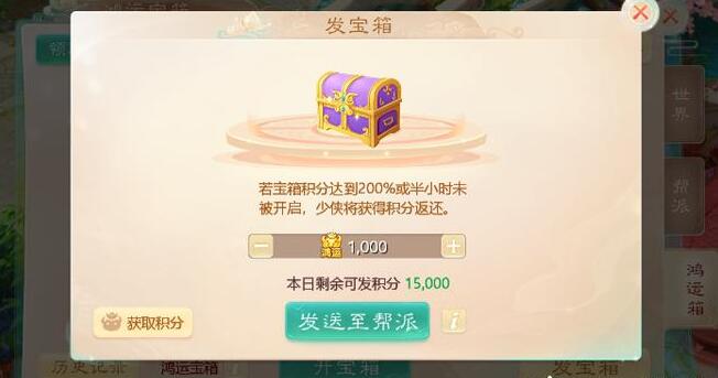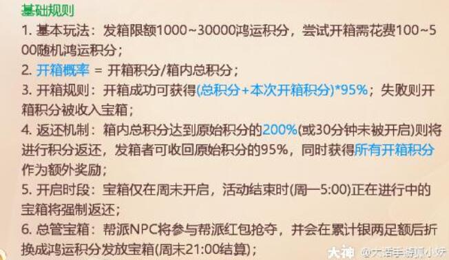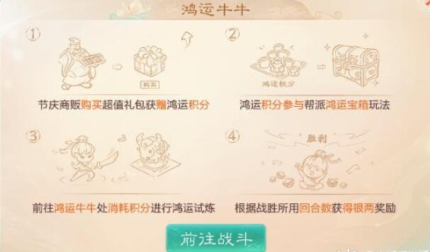 小猪带你看大话西游手游新版鸿运宝箱活动四部曲。 一:长安节庆商贩购买“烟花”同时额外获得鸿运积分; 二:在帮派红包-鸿运箱界面参与玩法,概率赚取更多鸿运积分并提升“鸿运试炼额度”; 三:攒够额度后,找鸿运牛牛消耗鸿运积分进行试炼战斗; 四:战斗胜利获得银两,战败或逃跑只能获少量奖励;
