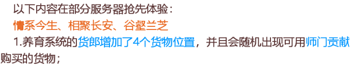 1.三个服务器放出,家园货郎由8个摊位提升至12个,师贡也许会购买橙色道具(猜测)。12个摊位会提升50%的购买效率,能省下不少时间。