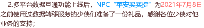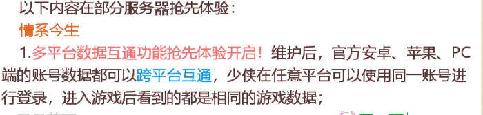 2.情系今生服务器抢先体验数据三端合一,以后手机也可以登录队友的苹果账号的游戏角色了!这里说明一下,渠道服不在互通范围内(大明哥是x游版本的,已经哭晕在厕所中....)。之前安苹互转的小伙伴也可以有一定的补偿哦。