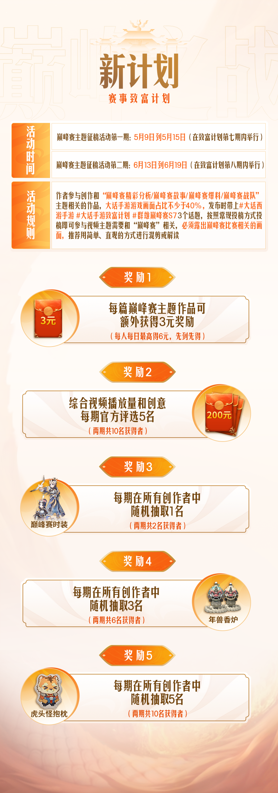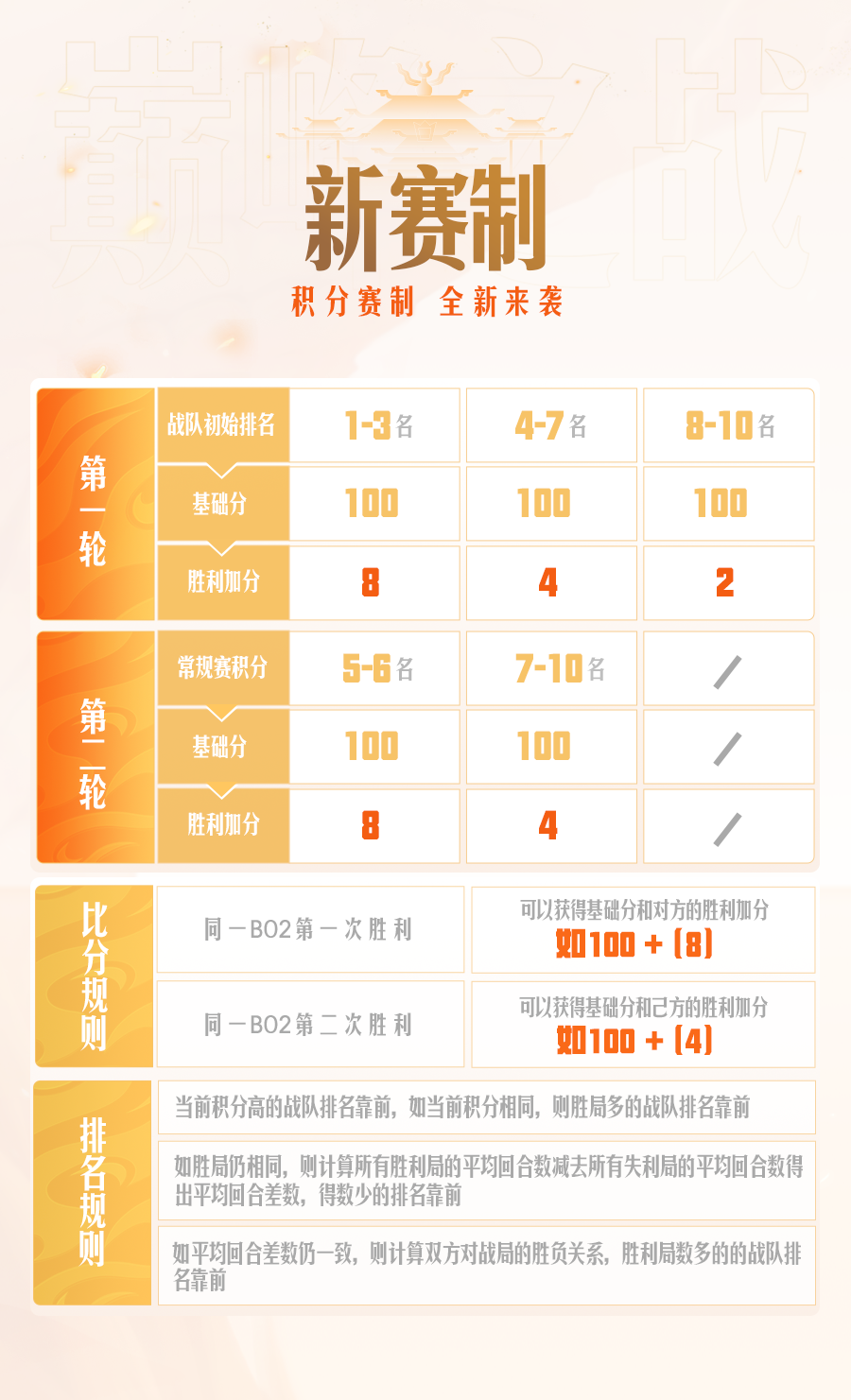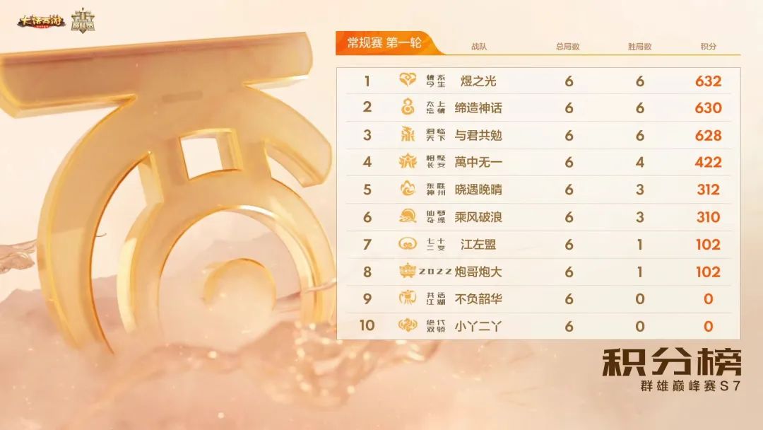 前三战队互相紧咬,这周谁能捷足先登? 薪火无尽,共逐巅峰!群雄巅峰赛S7常规赛第二周来袭!回顾上周,情系今生、太上忘情、君临天下三个战队都以全胜的战绩傲立前三,积分更是紧咬不放!进入到第二周,在新赛制加持下的巅峰赛局更是扑朔迷离,谁能捷足先登? 今日赛程 第一场:「太上忘情」VS「共话江湖」第二场:「相聚长安」VS「仙梦奇缘」第三场:「绝代双骄」VS「2022」 全新赛制 胜利加分 本届赛事将革新赛制,推出全新的胜利加分制!在两轮常规赛中,将会分别根据巅峰点总和及第一轮积分的排名,赋予每个战队不同的胜利加分。在BO2的对决中,胜利一次将可以获得自身的基础分和对手的胜利加分,胜利两次将可以获得双方全部的基础分和胜利加分! 全新计划,征稿“致富” 在巅峰赛期间,致富计划将开启巅峰赛主题征稿!在抖音发布巅峰赛主题相关的作品,除了获得致富计划累计月奖,每人每天可额外获得3元奖励,最高6元!综合视频播放量和创意还将评选5位创作者奖励200元。此外,还有巅峰赛时装、年兽香炉、虎头怪街坊抱枕等众多好礼你来拿! 更多赛事资讯,请锁定叶子猪《大话西游手游》官方合作专区。 [编辑:叶子猪小秘书]