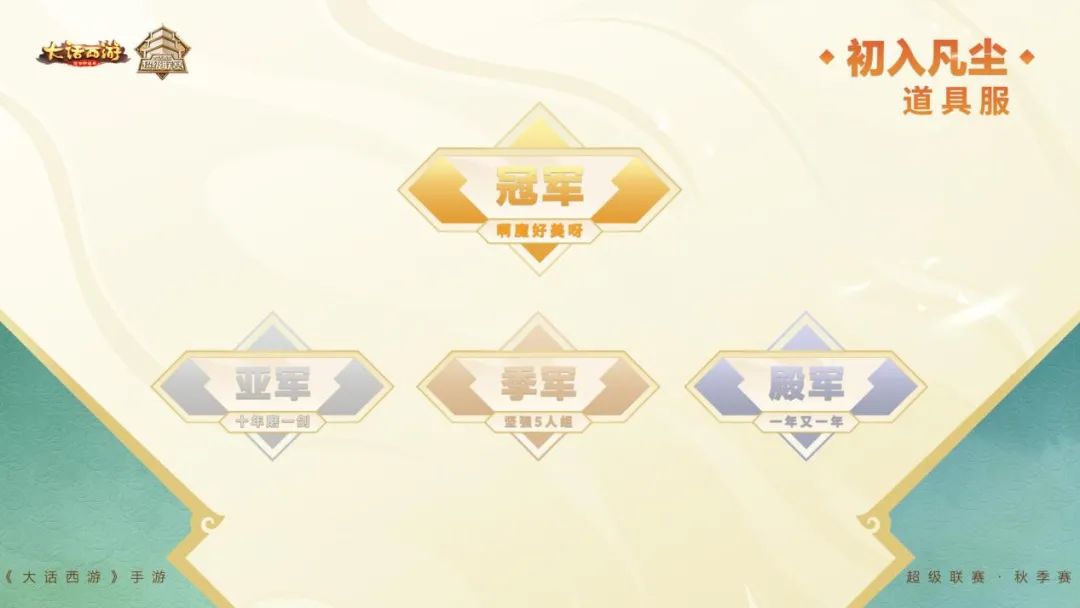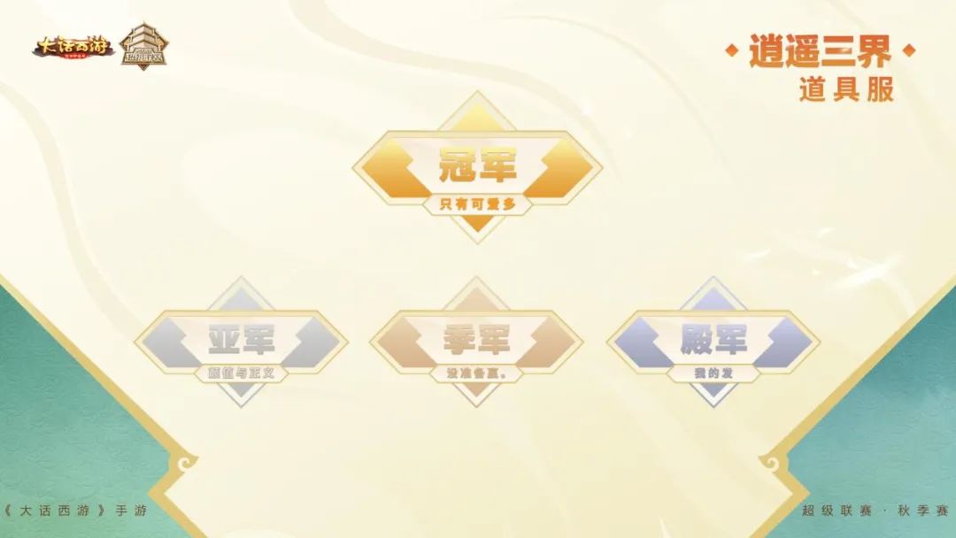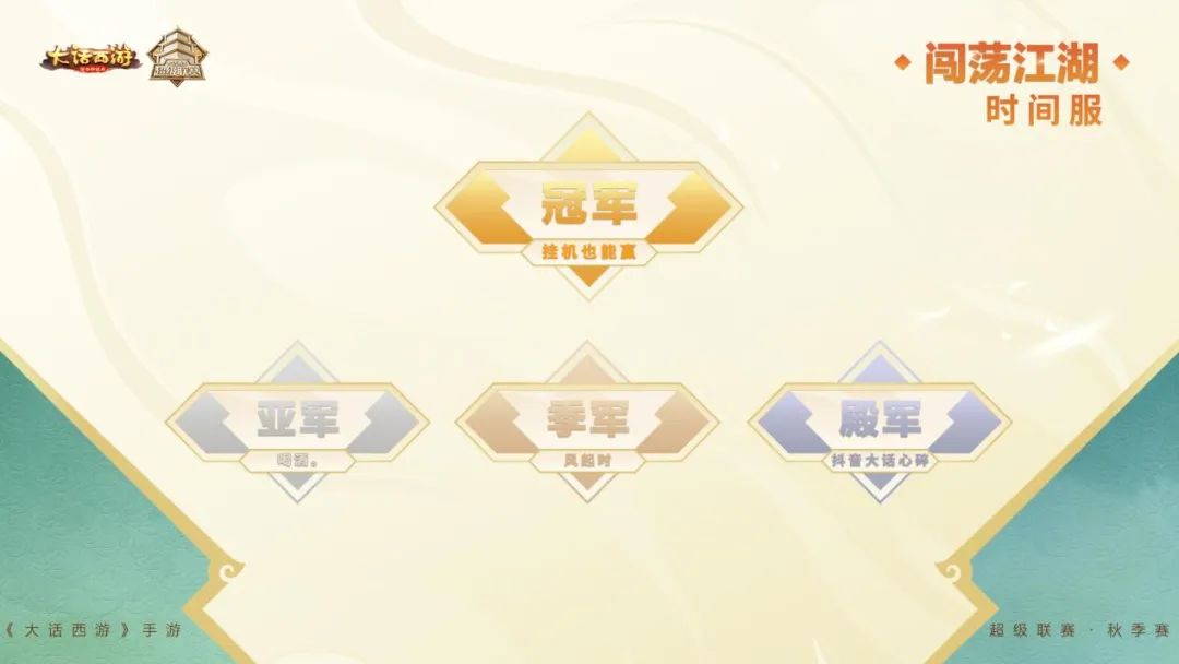 分级角逐,名振三界! 《大话西游》手游全民分级PK赛事 2024超级联赛·秋季赛于9月22日圆满结束! 经过多轮强强对决 五大组别冠亚季殿军火热出炉 让我们共同见证三界王者的诞生! 【道具服赛果公布】 三界至尊组别 冠军:萬中无一 亚军:煜之光 季军:瓜田李下 殿军:推车战神 三界战神组别 冠军:风华正茂 亚军:再度重相逢 季军:专职不服 殿军:又帅又能打 逍遥三界组别 冠军:只有可爱多 亚军:颜值与正义 季军:没准备赢。 殿军:我的发 闯荡江湖组别 冠军:迎男而上 亚军:冥火之光 季军:五手遮天 殿军:蛋蛋护卫队 初入凡尘组别 冠军:啊魔好美呀 亚军:十年磨一剑 季军:坚强5人组 殿军:一年又一年 【时间服赛果公布】 三界至尊组别 冠军:宇宙队 亚军:怪兽联盟 季军:开心养老丶 殿军:队伍招个仙 三界战神组别 冠军:一飞冲天 亚军:大头娃娃 季军:我们都是托 殿军:女仙是个猪 逍遥三界组别 冠军:云中鹰 亚军:傻龙一定赢。 季军:就是玩玩 殿军:佛系老北鼻 闯荡江湖组别 冠军:挂机也能赢 亚军:喝酒。 季军:风起时 殿军:抖音大话心碎 初入凡尘组别 冠军:噶腰子战队 亚军:暴走 季军:佛、 殿军:狗定胜天 2024超级联赛·秋季赛圆满落幕 再次恭喜五大组别的获奖战队“名振三界” 也期待各位少侠在未来比赛中有更加精彩的表现! 更多赛事资讯,请锁定叶子猪《大话西游手游》官方合作专区。 [编辑:叶子猪小秘书]