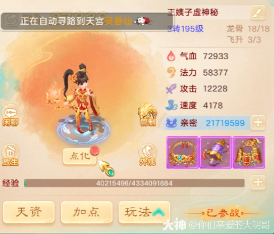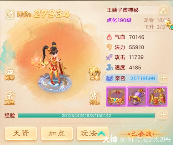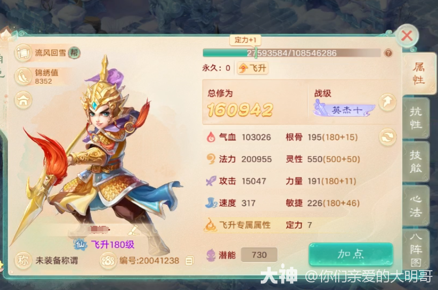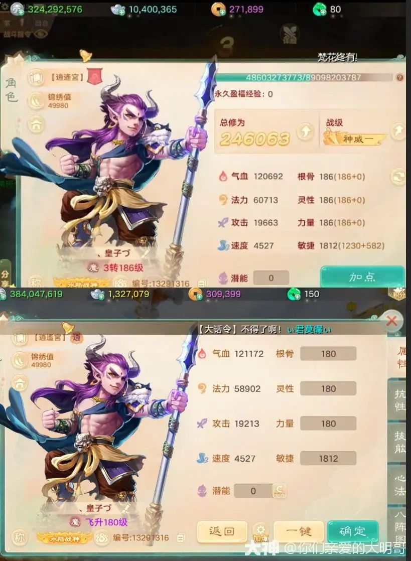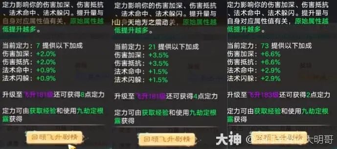 飞升系统已经在部分服务器测试了一段时间,此文总结一下目前已知的飞升体验,希望对广大玩家朋友们有所帮助。 1.飞升需要玩家达到三转180级,且法术熟练度要求全满,通过剧情任务(难度大概等同于地煞16星)即可飞升!名字变为紫色(更有韵味~) 2.飞升过后会永久免费获得一套“雷击木”花纹的时装【天雷九劫】,不可交易。 3.不论玩家之前是3转180级还是3转186级,转生后统一为飞升180级,多余的经验会储存起来,通过每天的修罗任务慢慢释放(注:测试期间每日释放5000多万,预计全服放送后会更多!)。飞升200级后会再增快释放速度! 4.飞升后会获得30点额外属性点。以敏魔玩家【皇子】举例,3转186级的速度为4527,飞升180级全敏加点速度同样为4527,并没有损失速度。但如果是3转180级飞升,速度就会提升数十点! 5.正常三转180级升到181级需要270亿左右的经验,而飞升180到181仅需要1亿多,181级到182级需要3.3亿。飞升大大缩减升级所需的经验,200级不再遥远。 6.飞升后法术熟练度会降到20000点,当飞升181级可以提升至25000点,单个群法消耗3.6亿师贡,单个单法需要消耗1.94亿师贡。飞升191级可以将法术熟练度上限提升到27500,费用现在还未知。 7.飞升后会送5点飞升专属属性——【定力】,并且每当人物获得10%的经验就会再送1点,目前来看是没有上限的。这个【定力】理解会比较晦涩,我详细展开跟大家讲一下。 【定力】会增加四个隐藏属性:伤害加深、伤害抵抗、法术命中和法术闪躲。加成效果不是线性增加而是逐步降低的。 上面的对比图【定力】数值相差近十倍,属性加成却没有那么大的差距,简单的说【定力】数值越到后期加成就会越少,同样的差值,前期提升的就越多。 另一方面,包括龙族修正在内(女龙法闪或男龙抵抗),角色本身就含有四种隐藏属性,加成就会减少,例如下图: 自身武器上含有“伤害加深4.1%”词条,体现在【定力】上的加成就会变少。 同样点数的【定力】,非炼器玩家就会比炼器玩家多出不少加成属性,进而缩小了差距! 飞升礼包里售卖的【九劫定根露】(5个),每个可以永久提升10点【定力】,前期提升效果明显,后期随着点数的增加,差距也会越来越小。 例如,非购入玩家14级【定力】,购入三瓶【九劫定根露】玩家【定力】44级,伤害抵抗相差2.2%;当非购入玩家44级【定力】,购入三瓶【九劫定根露】玩家【定力】73级时,伤害抵抗差值缩短为1.5%。 前期购入效果明显,后期差值逐步拉进,需不需要购入、购入多少,这就因人而异丰俭由己了。 8.召唤兽点化飞升需要召唤兽3转190级且亲密丹100万,抗性上限提升到125,再多送30点属性。 龙骨、成长、天资均不会变化,下图是朱雀点化后减少100万亲密、多30属性点朱雀的对比,很明显还快了! 9.伙伴飞升也需要3转180级,飞升后溢出的经验会直接变成“伙伴修炼册”返还到包裹里。 10.飞升专属修罗任务和“抓鬼”、“天庭”并无区别,也是消耗双倍经验击杀20个怪物。不过完成当日的修罗任务,可以返回一些储存经验。 11.地煞19星也是测试内容,具体可跳转地煞19星击杀指南!详细学习。 还有一些大家比较关心的问题,这里也一并解答: 1.飞升不会多一世修正,不会免费转形象。 2.目前没有新的角色形象,但不代表以后没有。 3.不能“欠款”提升法术熟练度。 4.飞升后多余的经验不会消失,非储存起来,慢慢释放。 5.【九劫定根露】是目前唯一的氪金点,【定力】提升前期效果明显,后期逐步缩进差距。 6.自身炼器属性越多,【定力】提升越少,相当于拉近了非炼器玩家和炼器玩家的差距。 7.大概率12月19日全服可以飞升。 8.新形象、新武器外观系统等,预计会逐步开放(开发组之前说会有,新魔王窟、新配饰、新召唤兽是我猜的)~ 9.地煞19星将加入到挑战中。 以上就是全部内容,更多后续资讯,请继续锁定叶子猪《大话西游手游》官方合作专区。 [编辑:叶子猪小秘书]