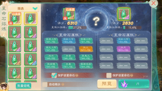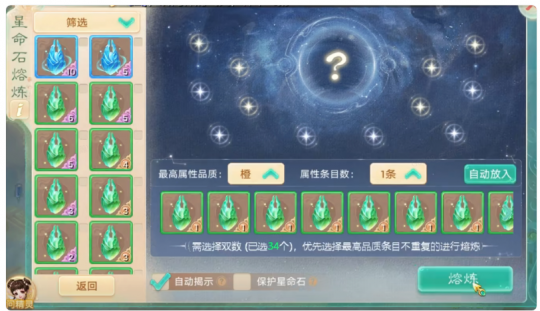 《大话西游》手游【临兵斗阵】资料片本周四全面上线!为了帮助三界少侠更快了解、上手星阵,开发组将以三期内容对资料片进行较为全面的介绍。 在第一期中,开发组为少侠整体解读了星阵系统,本期将介绍星命石。 星命石介绍 (1)星命石共有12类数值属性,包含抗控制上限、仙法抗性等。星命石主要为少侠的防御属性进行大幅直观而全面的加成; (2)每块星命石的属性条上限为12,每个词条属性不可重复,每条属性有绿、蓝、紫、橙四种品阶。 (3)点击星命石可显示其每条属性类型、以及对应的星阵加持率(星命石养成度越高加持率越高) (4)星阵加持率可加持提升所选择星阵的星阵属性、和星阵技能效果 星命石获取 (1)使用“灭相石”与“星芒”两种道具可炼制星命石,炼制出的星命石有2条随机属性(有概率得到待鉴定的大星命石-至少带1条橙色属性-可摆摊交易) (2)也可从摆摊购买“待鉴定的大星命石”,并用“星芒”鉴定成为至少带1条橙色属性的星命石! (3)日常PK和地煞星等玩法,也有机会掉落星命石或相关道具 星命石熔炼 (1)将两个星命石可通过熔炼为一个新的星命石,两个作为材料的星命石各自的属性都有一定概率继承到新的星命石中,且仅继承类型和品质,具体属性值在品质范围内重新随机; (2)属性词条分为绿蓝紫橙4种品质,不同品质词条在熔炼时的保留率不同,每条属性独立随机是否保留,当同一类型不同品质的属性都随机到保留时,会优先保留品质更高的属性。当两个星命石拥有某条类型、品质都相同的属性时,所有对应品质的属性都会有少量提升; (3)熔炼前可消耗一定货币或材料,选择保护其中一个星命石。在保护后进行熔炼,若对熔炼结果不满意,可以舍弃结果,恢复被保护的星命石; (4)熔炼次数超过30次后,可激活“批量熔炼”功能,可根据系统算法推荐策略进行熔炼(部分较为成品的星命石不可参与批量熔炼); (5)熔炼出新星命石后,揭示过程也充满神秘感,有开凿、探照、直接解锁等方式,更有参与趣味。 星命石福利 现在起体验星阵系统,只要完成几步引导任务,即可获赠满词条星命石一颗,相当于立享15级帮派修炼外加不俗的本种族核心属性(忽视、速度、躲闪等)提升哦! 参与【飞星点卯】活动,连续签到14天即可获得最终大奖—自选紫色星命石! 更多资讯,请锁定叶子猪《大话西游手游》官方合作专区。 [编辑:叶子猪小秘书]