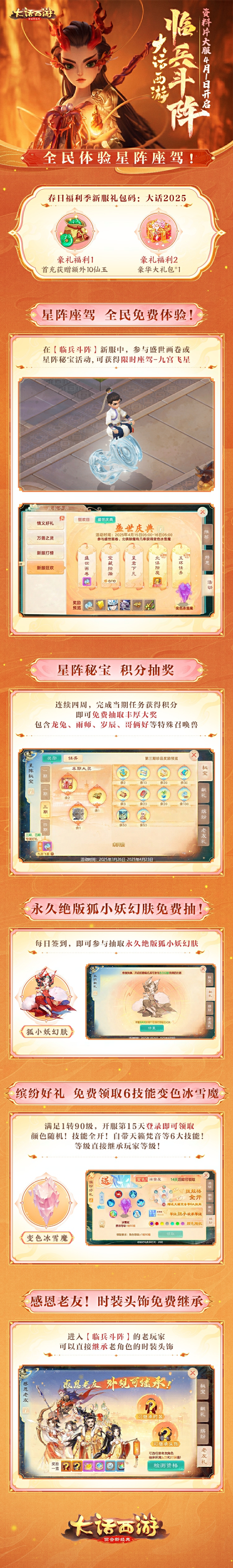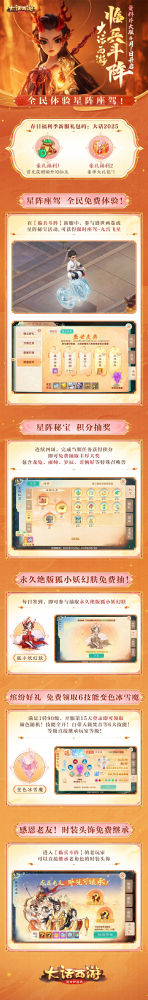 4月1日,大话西游手游资料片同名大服将会正式开启,新入坑的玩家可免费体验到星阵座驾·九宫飞星哟,一起来看看详细信息。 点击下图放大预览: 更多资讯,请锁定叶子猪《大话西游手游》官方合作专区。 [编辑:叶子猪小秘书]
