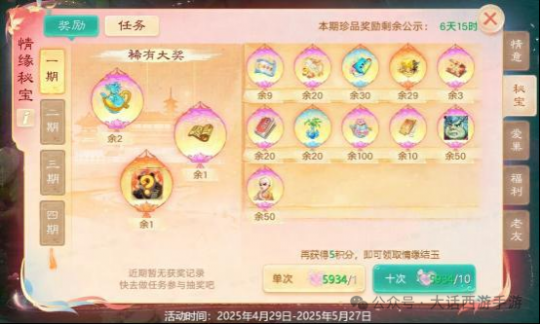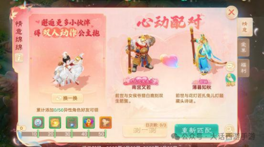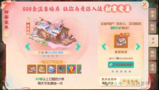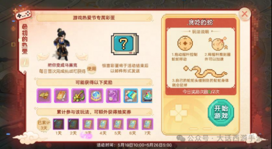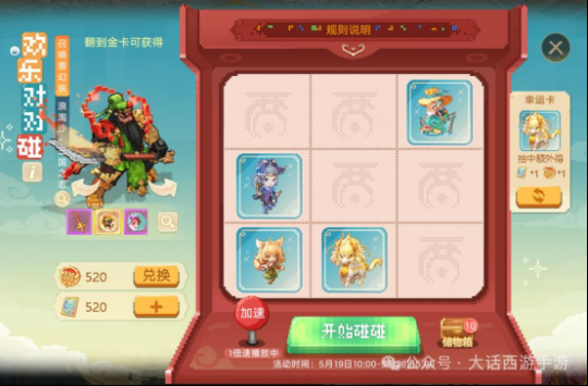【维护公告】 为了保证广大少侠的游戏体验,《大话西游》手游版将于2025-05-15上午8:00停机,进行每周例行的维护工作,维护时间为早上8:00-10:00,如果在维护期间无法完成维护相关事宜,开机时间将继续顺延,请各位少侠相互转告,并留意游戏时间,以免造成不必要的损失。对于停机期间给您带来的不便,敬请见谅,网易游戏感谢所有少侠的支持和配合! 【甜蜜恋爱服】 甜蜜恋爱服惊喜来袭! 全服热恋,甜蜜恋爱服惊喜登场! 恋爱服第四弹-【520】将于5月16日18:00开启预约; 甜蜜恋爱季,超级新服四连发!整整五月,惊喜不停,福利不停!甜蜜恋爱服将拥有专属的爱心标签! 5月20日12:00 开放[520]服务器 4月29日12:00 开放[千年等一回]服务器 5月06日12:00 开放[初恋]服务器 5月13日12:00 开放[爱你一万年]服务器 情缘测试 甜蜜恋爱服,预约创角即可参与情缘测试! 本服专属测试:测一测前世姻缘! 根据测试结果,在开服后获得专属称谓:恋爱脑、海王、甜妹等,每个新服还有专属稀有称谓; 开服后,还会根据测试结果为你匹配一位情缘深厚的对象,展开一场不期而遇的邂逅! 情意绵绵 相遇是缘,情意绵绵,参与情缘测试匹配心动对象! 添加异性好友还可以领取首个亲密双人动作【公主抱(永久)】! 公主抱:少侠获取该动作后,即可作为抱起者发起双人动作邀请;其他少侠接受动作邀请后,即可抱着对方到处逛街啦! 情缘秘宝 【甜蜜恋爱服】每个新服都为广大少侠们准备了一份精彩豪礼! 活动期间,少侠只需完成游戏内常规活动或任务,即可获得积分领取情缘结玉,使用情缘结玉开启赠礼即有机会获得龙兔、1级五行材料等惊喜奖励!首周还有随机五常神兽降临! 甜蜜爱巢 甜蜜恋爱,免费送婚房!500套家园主题为已婚少侠备好婚房,每日均可参与抽取,还有半价家园主题、折扣家具限时放送! 送变色冰块 新服专属·天籁梵音灵宠限时放送! 本次系列新服中,零门槛必领满配神宠!次日登录还送爱心小萌猪座驾(限时7天体验)!必得变色冰雪魔:角色达1转90级,第15天登录即领! 外观颜色随机:全色系随机发放,猛男粉必定适合你! 顶配战力直送:自带【天籁梵音】等6大召唤兽技能,开局即巅峰! 逆天继承机制:灵宠等级同步角色,落地即享满级战力! 外观继承 感恩老友,外观继承! 本次系列新服的少侠可在60级时,领取老角色拥有的一套时装和头饰,并可将其升级至永久外观! 现金豪礼 新服豪礼·百元现金红包狂撒全服! 新人专属零门槛福利:入驻本次系列新服任一服务器的新朋友,都可以在游戏中领取五个现金红包(先到先得,送完为止),1-10元真金白银秒到账! 相遇返利 少侠可在本次系列新服中的任一服务器中领取2024年度的充值返利(仅能领取一次,若在之前服务器已领则无法参与) 返利规则如下: 1)2024年度充值额度在50元及以上,则可以领取返利; 2)充值低于[500元人民币]部分按照50%进行返还; 3)充值多于[500元人民币]的部分按照10%进行返还; 4)最多可获得500元人民币的返还额度; 5)返利将以“金镶玉”的形式进行返还; 6)金镶玉可在多宝阁中抵扣部分仙玉进行使用; 【游戏热爱日】 你是否还记得人生中的第一款游戏?那是一个家家户户都在用彩色电视机的年代,没有智能手机也没有平板电脑。蝉鸣的午后,我们叼着冰棍喝着碳酸饮料,来到邻居小孩的家里,七手八脚地将游戏卡带插入学习机,随着8bit音乐的响起,绚丽的像素画面填补了忧郁的童年——如今,那些经典的元素将会在大话西游中再现,跟随我们的步伐,将时钟重新拨回到那个无忧无虑的童年。 活动时间:5月19日(周一)10:00~5月26日5:00 本季的520游戏热爱节将会以“像素风”为主题,为少侠们带来经典玩法复刻,以及好玩新奇的像素风主题外观。 贪吃的蛇 5月19日10:00起,少侠每日可与长安城“打电玩的小孩”对话,与其他少侠一同重温经典玩法:贪吃的蛇,每日前2次游玩达标可获得奖励,最高可获得1级五行!少侠每日游玩后,还可额外领取“欢乐对对碰”抽奖券“欢乐卡包”,抽取座驾幻肤、召唤兽幻肤和像素风武器幻肤。除此之外,还有好玩的马赛克彩蛋道具:可以将好友变成马赛克的魔法棒,以及特殊的拍照滤镜等待少侠体验~ 欢乐对对碰 活动时间:2025年5月19日10:00-5月26日5:00 活动简介:欢乐对对碰,好运碰出来! 使用欢乐卡包铺满九宫格即可开奖,可翻出九种普通卡牌以及一种金卡; 翻出相同卡牌可以触发对对碰、三连碰、四连碰、六连碰获得不同奖励,若包含不同的全部九张普通卡牌即可触发全家福!每次奖励都会返还一定数量的欢乐卡包,欢乐碰不停! 翻出珍贵的金卡即可随机抽取一款外观大奖,包含520全新武器幻肤火之高兴、神兽幻肤浪淘沙·三国之志、特殊幻肤哥俩好·战斗之魂、木牛流马座驾幻肤牛码奔腾、返场座驾只因有你、偃甲大师等; 使用欢乐积分亦可在兑换商店中兑换上述外观以及其他更多珍贵好礼; 无限热爱 活动时间:2025年5月19日10点-5月26日5点 1)超值商店上新,少侠可刷新商店购买心仪的商品;购买商品获得幸运值,幸运值满后下次刷新后所有商品享受额外折扣! 2)当购买商品次数达30/50/70次时,商店升级,商店升级后,售卖商品数量提升,同时幸运值满时可能刷新出额外折扣更低的商品; 3)购买商品次数达标时,还可以领取复刻座驾·木牛流马、座驾幻肤·牛码奔腾、武器幻肤像素巨剑、绝版时装礼盒等珍贵道具。 鸡驴巡游 520,超级热爱。惊喜不断,