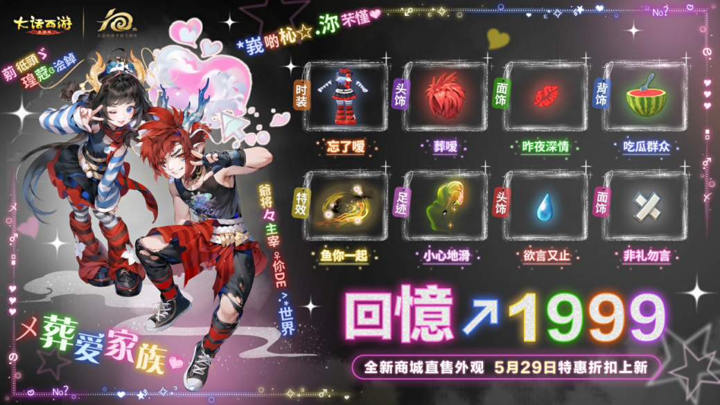 解码转译)冷少,是时候重出江湖了!让这些凡人见识见识,我们葬爱家族的风采了! 冷少忘了爱,丫头永远在!这一次,铁蛋携手少侠守护“葬嗳”传奇,点燃千禧年的记忆! 时代与时代碰撞,回忆和现实重叠,全新“葬爱家族”系列外观明日正式上线!新时装、新头饰、新面饰等装扮道具全都有! 5月29日至6月5日活动期间,新装“忘了嗳”8折直售。其他单品均享受7折优惠,更有永久称谓“葬爱家族”、永久头饰“葬嗳”相送! 你们快看,狐美人、逍遥生穿戴上了全新头饰和时装,都开心得跳起来做劈叉了#24 接下来,就由铁蛋带你们盘点外观商城都有哪些新出“好货”吧~ 新装【忘了嗳】&新头饰【髒嗳】 全新时装“忘了嗳”引领潮流回忆杀,搭配新头饰“髒嗳”简直绝绝子! 造型整体以红黑二色为主,正是那时最流行的炙热与冷峻!男女同款的简约黑色背心上衣,无论季节都必须焊在手臂上的袖套,超短裙、白腰带,集结了时下最流行的元素,女装堆堆袜以及男装的破洞紧身裤更可谓是“点睛之笔”! 新装更配有染色效果,赤橙黄绿青蓝紫,你喜欢的样子全都有。葬爱家族穿的必须有颜色,才能更出色! 还有新背饰【吃瓜群众】&【好多鱼】&【心态平荷】,新头饰【你有冰吧】&【一怒之下】&【欲言又止】&【昨夜深情】,新面饰【非礼勿言】&【封印之瞳】,更多精彩内容,请看下方长图~ 5月29日至6月5日期间,全新“葬爱家族”系列外观正式上线,多款外观任君选择,活动期间更享受最低7折优惠,不要错过哟! [编辑:月光下完美]
