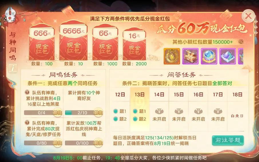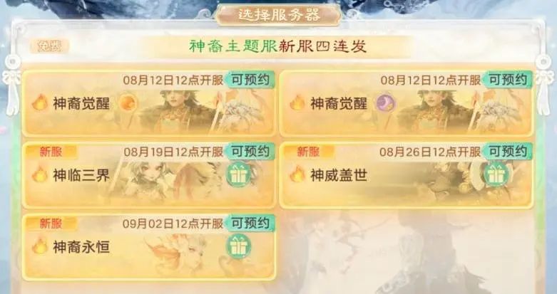 【维护公告】为了保证广大少侠的游戏体验,《大话西游》手游版将于2025-08-14上午8:00停机,进行每周例行的维护工作,维护时间为早上8:00-10:00,如果在维护期间无法完成维护相关事宜,开机时间将继续顺延,请各位少侠相互转告,并留意游戏时间,以免造成不必要的损失。对于停机期间给您带来的不便,敬请见谅,网易游戏感谢所有少侠的支持和配合! 【神裔首发服】 全新门派神裔首发,超级新服震撼上线! 超级新服 全新门派神裔首发,首创召唤师门派! 超级新服第二弹-【神临三界】将于8月15日18:00开启预约; 神裔觉醒,超级新服四连发!整整八月,惊喜不停,福利不停!九州三界等你开创全新格局! 8月12日12:00 开放[神裔觉醒]服务器 8月19日12:00 开放[神临三界]服务器 8月26日12:00 开放[神威盖世]服务器 9月02日12:00 开放[神裔永恒]服务器 免费领花妖 神裔临三界,神裔首发服每个新服都为广大少侠们准备了一只稀有召唤兽:花妖!只要等级达到10级即可领取,伴你游历三界! 海量现金红包 全新门派神裔现世,新服争当开宗弟子!活动期间,每日截止至19:30,综合实力榜每个分榜的前100名侠士,都将成为开宗弟子!每日角逐抽取6666元超级现金红包、一级五行材料、高级藏宝图等丰厚奖励! 夺宝怀旧灵兽 神裔现世,镇派之宝散落世间,有缘者得之!输入口令开启宝箱即有机会获得自带怀旧幻肤的特殊召唤兽:泥石怪、黄金兽、冰雪魔、猴精! 福袋抽龙兔 神裔首发服每个新服都为广大少侠们准备了一份精彩豪礼! 活动期间,少侠只需完成游戏内常规活动或任务,即可获得积分领取神裔福袋,使用神裔福袋开启赠礼即有机会获得龙兔、1级五行材料等惊喜奖励! 送变色冰块 新服专属·天籁梵音灵宠限时放送! 本次系列新服中,零门槛必领满配神宠! 必得变色冰雪魔:角色达1转90级,第15天登录即领! 外观颜色随机:全色系随机发放,猛男粉必定适合你! 顶配战力直送:自带【天籁梵音】等6大招魂兽技能,开局即巅峰! 逆天继承机制:灵宠等级同步角色,落地即享满级战力! 外观继承 感恩老友,外观继承! 本次系列新服的少侠可在60级时,领取老角色拥有的一级时装和头饰,并可将其升级至永久外观! 现金豪礼 新人专属零门槛福利:入驻本次系列新服任一服务器的新朋友,都可以在游戏中领取五个现金红包 (先到先得,送完为止),1-10元真金白银秒到账! 仙玉返利 少侠可在本次系列新服中的任一服务器中领取2025上半年的充值返利(仅能领取一次) 返利规则如下: 1)2025年1月1日~6月30日期间充值额度在50元及以上,则可以领取返利;(若在之前服务器已领,则无法领取) 2)充值低于[500元人民币]部分按照50%进行返还; 3)充值多于[500元人民币]的部分按照10%进行返还; 4)最多可获得500元人民币的返还额度; 5)返利将以“金镶玉”的形式进行返还; 6)金镶玉可在多宝阁中抵扣部分仙玉进行使用; 【大乐嘉年】 嘉年华总览 共话十年·序篇-大乐嘉年开启!十周年不仅有全新门派初献礼,还有线下嘉年齐欢庆!大话西游与你相约天津,领略九河下梢的漕运风华,感受曲艺之乡的哏儿都魅力~ 1)线下嘉年华将于8月16日、8月17日在天津举办,线上也将同步进行直播; 2)游戏内《大乐嘉年》活动将持续2周(8月7日维护后-8月21日5:00),≥0转80级的少侠可参与。为庆祝十周年新门派上线,准备了海量嘉年华福利:将送出60万现金红包、典藏变色年、随机神兽、技能保护券、终极万兽园令牌、永久外观(背饰、空间挂件)等免费福利,同时将开启星君下凡活动; 本周维护后迎来《大乐嘉年》狂欢阶段,将开启以下活动: 星光耀天津 大话嘉年华来临,参与嘉年活动获取“星光”,带至津门照亮整个天津卫! 1)嘉年华期间,全体少侠将分为“星光引路人”与“星光委托人”两种身份,拥有线下嘉年华门票的少侠可在8月16日5:00前,主动申请成为“星光引路人”,全体少侠都可成为“星光委托人”,(引路人可获得丰厚的引路人专属奖励)。 2)“星光引路人”可携带“星光委托人”的星光前往天津嘉年华,完成线下打卡,完成打卡任务后,引路人与他的全部委托人都将获得以下权益:嘉年华永久背饰——狗都不理获取所需星光大幅降低(由累计600星光→300星光),星光抽奖活动打卡后提前开启,否则需至8月18日10:00方才开启抽奖。 3)成为引路人或委托人还可获得“终极万兽园令牌”(大幅提高终极技能领悟概率)。 4)8月14日更新后,开放全服委托,可以向非本服的“星光引路人”发起委托。 与神同鸣 为庆祝新门派神裔上线,将送出60万现金红包(合计156480个)和大量稀有道具奖励: 1)活动时间8月12日5:00-8月20日5:00,≥80级的少侠可参与; 2)8月19日5:00前完成【问答任务】和【同鸣任务】即可优先瓜分60万现金红包; 3)【问答任务】需要12道题目全部答对才算完成(关键); 4)【同鸣任务】四个任务中任意完成两个即算完成; 神裔巡游 1)气派的鸡驴大花车建成后,将在每天18:00后,每隔15分钟于长安巡游1次,每次巡游持续约10分钟; 2)少侠们可前往参加巡游,获得巡游糖果,每天最多5个(食用糖果还有几率获得随机神兽噢~); 3)花车巡游时拼手速登上鸡驴大花车的少侠还能够获得限时专属称谓花车勇士~ 神裔净化行 活动时间:8月7日10:00-8月21日5:00 梼杌虽然已被击败,但大乐之野也被封印,现在只有使用无的之矢逆转时空,不过无的之矢的能量耗尽了,请少侠收集灭相者的能量为其充能。 1)活动期间,等级
