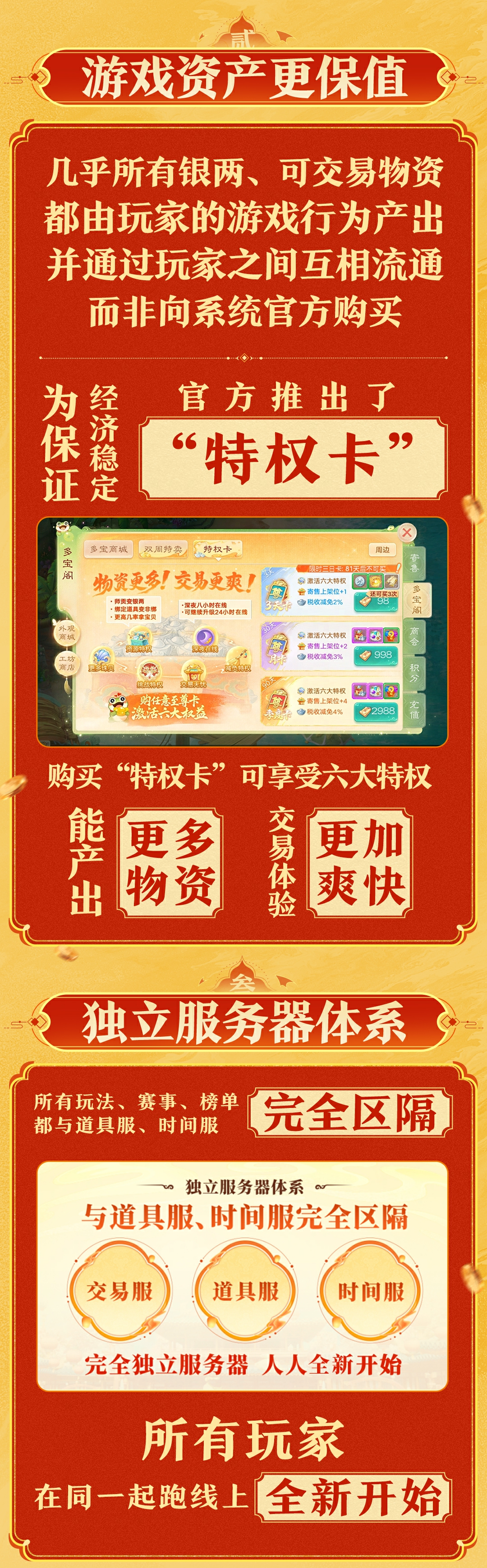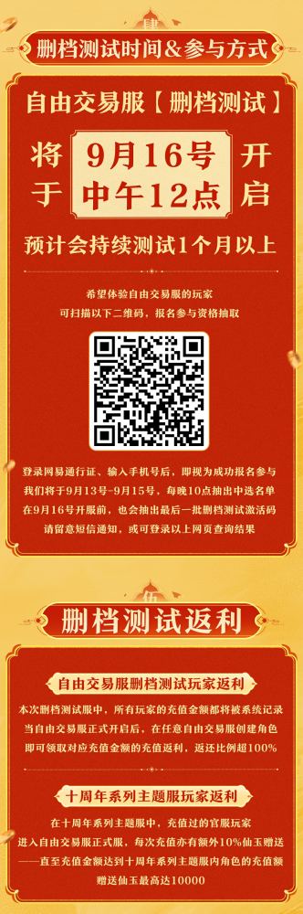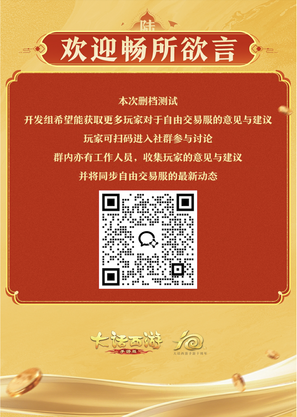 大话少侠久等了!自由交易服,它来了! 《大话西游》手游十周年,正式推出超重磅更新内容——自由交易服! 这将是一个颠覆回合制手游传统,追求交易自由与资产保值的全新三界! 这一次,我们的目标是:开放市场,让玩家交易更自由,致富更随心! 此篇文章将带你全面盘点关于自由交易服及删档测试的所有信息,精彩不容错过! 自由交易服核心亮点:真自由、更保值、新起点! 【亮点一:真正的自由交易,无拘无束】 在自由交易服中,游戏内所有非绑定的道具以及召唤兽,包括非珍品的召唤兽、装备、九彩晶石、佩饰均可自由定价,自由交易。 其中,有三种交易方式供玩家选择: 【摆摊】:游戏内场景,可创建个人交易摊位。在这种交易方式下,玩家可上架任意道具/召唤兽,没有价格区间限制,并且摆摊还拥有收购功能。 【当面交易】:同屏玩家点击头像即可发起1对1的交易。三界交易自由度最高的全新交易模式!道具/召唤兽任选,价格任意填,系统0审核0干预! 【寄售】:道具服种最常见的多宝摆摊交易,在自由交易服当中,被称之为“寄售”。在这种交易方式下,道具上架之后,即可面向所有玩家进行出售,是最快捷的交易方式。 最重要的是,无论哪种方式,交易完成无需审核,银两与物品即刻到账!真正的自由,从交易开始! 【亮点二:游戏资产更保值】 自由交易服的经济体系将以玩家行为为核心: 几乎所有银两和可交易物资,均由玩家产出,在玩家间流通,而非直接向系统购买。 同时,为确保市场稳定与物资产出可控,我们特设“特权卡”机制。购买特权卡可享六大特权,助你产出更多物资,交易体验更爽快! 通过这套全新的经济系统,大话手游立志达成回合制手游中“最保值”的标杆! 【亮点三:独立服务器体系,公平起跑】 自由交易服,是一个完全独立于现有道具服、时间服的全新服务器体系! 所有玩法、赛事、榜单均独立运行,与现有道具服、时间服完全区隔。 这意味着在自由交易服,所有玩家都将站在同一起跑线上。 这是一个全新的开始,能让玩家们重温最纯粹的游戏乐趣与挑战! 自由交易服删档测试开启!返利规则公布! 《大话西游》手游自由交易服即将开启删档测试!如何参与测试?速看下方简要 【限量激活!扫码参与测试资格抽取】 测试开启时间:9月16日(周二)中午12:00 首服名称:【长安城】 测试说明:本次为限量删档测试,将持续一个月。旨在收集反馈,优化自由交易服体验。 获取测试资格:长按识别下方二维码,登录网易通行证并输入手机号,即视为成功报名参与资格抽取! 资格发放:官方将于9月13日-9月15日,每晚10点抽出一批自由交易删档测试的激活码,发放给中选的玩家。在9月16日开服前,也将抽出最后一批删档测试激活码。 除此以外,少量激活码也将通过抖音直播、短视频致富计划、社群、网易大神等途径投放,敬请关注官方动态! 【删档测试返利规则】 测试充值超额返还: 删档测试期间所有充值金额,将在自由交易服正式上线后全额返还,且返还额超100%! 十周年新服玩家专属福利: 在十周年系列主题服(十年4个道具服)充值过的官服玩家,进入自由交易服正式服后,每次充值额外获赠10%仙玉!此福利持续有效,直至累计赠送仙玉价值达到该角色在十周年服的总充值额(最高赠10000仙玉) Ps:详细返还规则以游戏实际为准~ 自由交易,畅所欲言! 开发组诚挚邀请所有玩家参与本次测试,为自由交易服的完善提出宝贵意见与建议! 扫码加入下方自由交易服专属社群,与志同道合的玩家畅聊,工作人员也将在此收集玩家们的意见与建议! 社群将同步最新动态、测试资讯及优化进展,是您了解自由交易服的第一窗口! 十周年巨献,大话手游自由交易服即将登场!对于自由交易服的到来,少侠有何想说的? 在此篇文章评论区留言,铁蛋将从中抽取10位玩家送出现金红包一份哦~ 自由交易服核心内容,可看下方长图! [编辑:月光下完美]