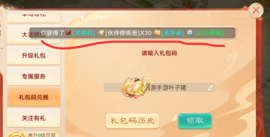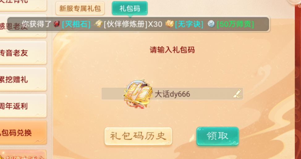 大话西游手游礼包码2025最新,大话手游礼包码大全,礼包码兑换输入【大话西游手游叶子猪】,即可领取50W师贡、伙伴修炼册、星芒头像框等奖励!告诉大家一个好消息:叶子猪整理了大话手游最新礼包码20个,亲测有效,建议收藏! 首先,第一个大话西游手游版十周年庆礼包,游戏等级达到10级,主页面点击福利→礼包码兑换→输入【大话西游手游叶子猪】,就可以领取最新大话礼包内容: 伙伴修炼册*30 凝魂丹*1 无字诀*1 1级宝石*1 50w师贡*1 星芒头像框(7天)*1 “大话西游手游叶子猪”这个礼包,与其他官方礼包不冲突,没有任何限制,大家可以放心激活使用!接下来再给大家分享2025年9月最新礼包码,每月都可以重复领! 新服专享: 福利666(仅限新服10-32级领取) 点击新服专属礼包,输入福利666,邮件中领取开服欢庆礼,打开可获得专属特权大礼包,注意这个礼包只在新服可以用,而且只在32级之前可以用。 全服可用(没有等级限制,注意小写,建议手动输入): dh888 dh666 zhuyin666 qiaoshan666 zixia666 dhtd6666 dhxy666 大话af666 神裔觉醒 小红书8月福利 玩神裔看阿福 大话手游新服大礼 大话西游手游十周年 大话手游2025 十周年快乐 大神666 大吉大利 大话dy666 大话ks666 《大话西游手游》2025年最新礼包码(每月持续更新),20个礼包码叶子猪都是一个一个测试的,绝对有效放心兑换,轻轻松松拿到1000万师贡,480本伙伴修炼册,还有诸多宝石凝魂丹等道具奖励。 叶子猪大话手游最新礼包码,每个月叶子猪还会持续更新,因为每次新服或节日活动,官方都会线上发放福利礼包,比如这次的十周年,还有接下来的国庆节、中秋节等等,大家也记得上线领礼包哦~ 此外,网上通用礼包码有些都过期了,建议大家还是收藏本页面,叶子猪会持续更新大话最新礼包码,帮助大家拿到所有官方福利。 如果怕遗漏错过了,可以搜索“叶子猪大话手游”,专区查看(http://xy2.yzz.cn/sy/),搬砖组队、福利活动、礼包获取,欢迎加入叶子猪大话手游交流群! [编辑:ssc]