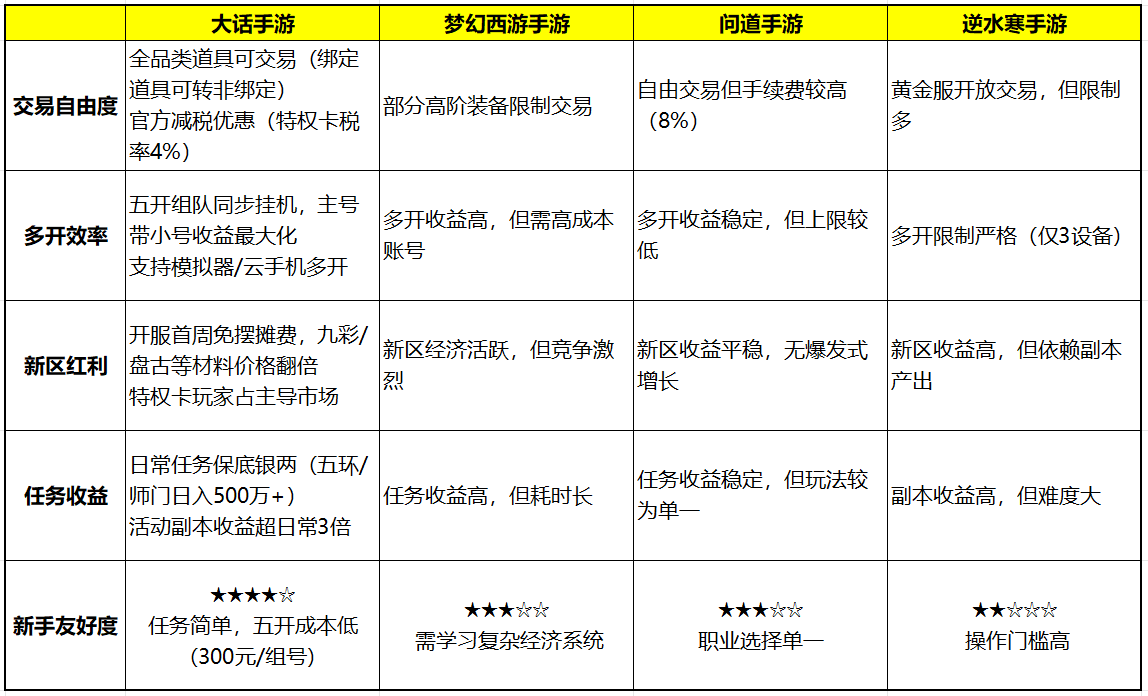 大话西游手游搬砖五个号一天能赚多少钱?大话手游搬砖轻松月入一万?大话手游目前是非常适合新手五开搬砖的,特别是即将开放的自由交易服,更给了商人玩家大展身手的机会。 我们先简单来对比一下,目前市场上大话手游VS其他搬砖手游的特点: 相对来说,叶子猪觉得大话手游更适合新手搬砖,一个是组号投入成本低,支持手机多开/模拟器,再一个就是任务副本难度小,产出也相对稳定,还有一个就是玩法多样性,六大种族都有各自独特的机制。 可以这么说,如果你懂得在梦幻西游手游搬砖,那你一定可以轻松在大话手游搬砖,咱们这个对比不是说其他游戏不适合搬砖,而是说更适合新手玩家的。当然这个也是要看你习惯玩哪种类型的游戏,技术党完全可以玩动作类,RPG类的,MOBA类的,当个代练收入不菲。 在大话西游手游中,你只要了解“低买高卖”这个道理,搞几个银子号就能当“倒爷”,创建好一组号之后开始任务升级,然后再把值钱东西倒卖掉,勤快的话一个月1000~2000收入是没问题的。 比如五开搬砖的话,1主号+4小号分工协作,主号打高收益副本(如塔8/塔9),小号挂机产出材料(采矿/种田),日均收益可达2400万银两(约60-80元)。 再算下日常保底,五环任务日入40万银两+50万师贡,大雁塔保底120万银两,其他任务300万银两,单账号日收益约480万银两(约12-16元)。这还没算上跑完200环,基础银两收益也有200万银两左右,七七八八算下来,一个月赚个一两千零花钱没问题的。 如果自由交易服正式开放了,你还能买个特权卡24小时离线挂机,利用午休/夜间挂机抓鬼、挖宝,把时间利用起来搞些新区刚需材料,比如九彩云龙珠、盘古精铁、金柳露等核心强化道具,低价扫货,后期高价抛售,赚个差价就美滋滋了。 大话手游新区约10万银两=1元,老区约30万银两=1元(不同区有所波动),五开+特权卡玩家日均收益2400万银两,扣除成本(月卡/账号费)后月入约6000-8000元;若叠加新区囤货(如单周赚4000万银两,约400元),月入破万可行。 以上就是今天的所有内容,相对回合新手玩家而言,大话手游任务流程固定,操作门槛低,确实是比较适合五开搬砖的。如果你有其他不同见解,欢迎加入叶子猪大话手游交流群,一起来交流赚钱心得! [编辑:ssc]