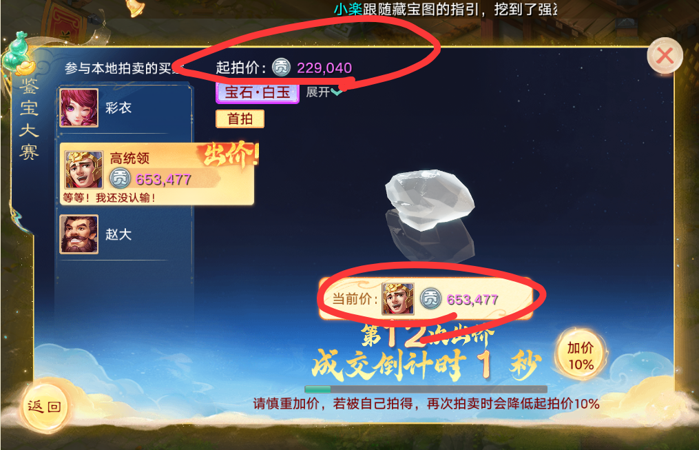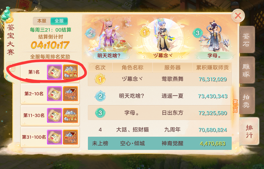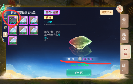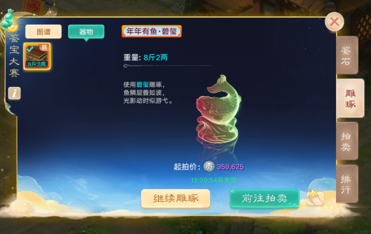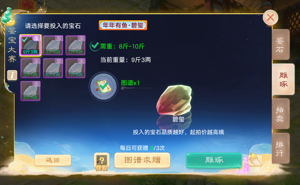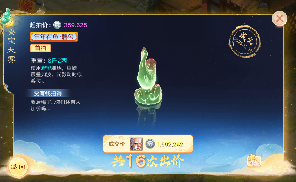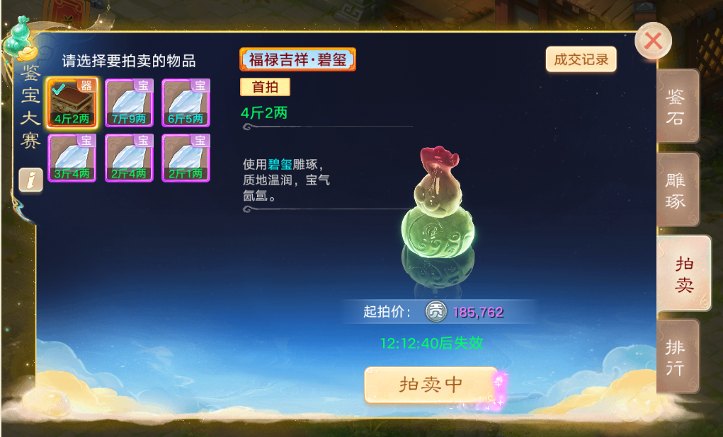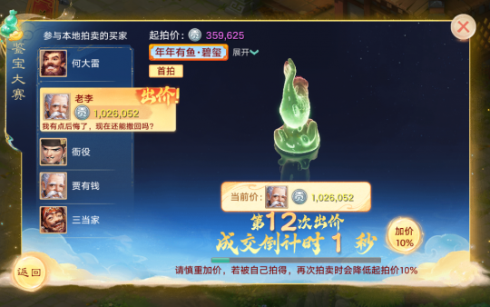 大话手游鉴宝大赛怎么玩?手游里面也能玩石头,古玩鉴定可太有意思了,经常看到一些切石头的视频,一刀穷一刀富,玩的就是心跳! 没想到大话手游新版本,把原石鉴定搬进来游戏内,想要一刀切出冰种,三刀切出翡翠的朋友,可以来鉴宝大赛感受一下了,叶子猪体验之后,发现真的很刺激,下面细说玩法。 交易服自由搬砖收物资 新区固定队组队交流! 首先,鉴宝大赛是限时活动,大家注意一下活动时间,2025年12月11日——2026年1月8日,元旦也可以在家切石头了。 每天通过活跃进度奖励,达到50/75/100点活跃度,便可以获得一把镐子,用来挖掘原石的,第一次挖不出来没关系,可以继续挖掘,一般一个镐子都可以挖出一块重量大小不等的石头。 得到原石矿石之后,我们可以进行鉴定,每一块石头有三次免费鉴定机会,切第一刀一般看不出什么好东西,叶子猪测试发现,还要最好要切够三刀,才能鉴定出水晶、玉石、翡翠等 珍贵宝石。 比如叶子猪就开出过碧玺、白玉、欧泊、青玉等宝石,然后宝石可以根据重量,选择不同形状的图谱进行雕琢,每一张图谱对应的宝石重量不一样,投入的宝石品质越好,起拍价格越高。 我用一块9斤3两的碧玺,雕琢年年有余,本来这块碧玺起拍价只有16.4W师贡,雕琢完成之后,起拍价一下子变成了35.9W师贡,直接翻倍了属于是,美滋滋啊! 然后拍卖过程的话,大家也可以根据商人的出价,适当加价10%,如果宝石、器物抢手,那你可以一直加价,如果没人要的话,那就要及时停手加价了。 因为如果加价后没人再出价,系统会默认为被你自己拍得,那么再次拍卖时,起拍价也会降低10%,得不偿失了。最终叶子猪这块16.4W师贡的碧玺,雕琢成年年有鱼器物后,成交价是150W师贡,感觉靠挖宝石、鉴定石头赚够一个亿师贡也不是不可能! 宝石、器物都可以进行拍卖,只不过,宝石起拍价比较低,最终拍卖成交价也远不及器物的价格,建议大家还是多多收集图谱,将宝石雕琢成器物后再进行拍卖变现。 当然了,如果你有一手加价小技巧,也可以尝试拍卖宝石,大概第10次出价后,最好就要停手加价,不然很容易砸在手里,系统正常第12次、第13次出价后,就会成交了。 另外,鉴宝大赛也可以获得银两,只要你冲击每周本服、全服排行榜,上榜第一名可以获得8亿银两,第2~10名是18888万银两,第11~30名是8888万银两,第31~100名是3888万银两。想要赚取大量师贡、银两的大话兄弟,赶紧去鉴宝吧! 交易服自由搬砖收物资 新区固定队组队交流! [编辑:ssc]