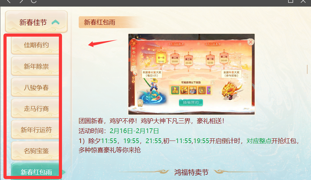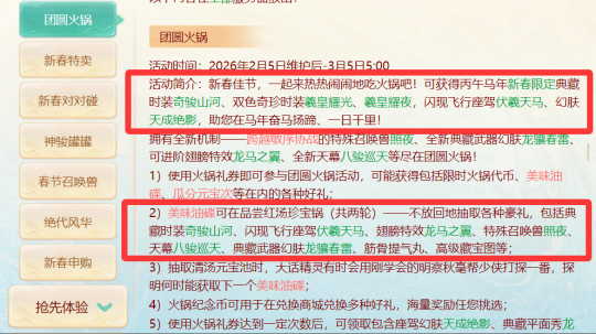 大话西游手游年味越来越重了,新春版本“马上到家”,围绕寻找新八骏展开,目前开放的世有伯乐活动,从征马、相马、醒马、策马四个篇章,为我们讲述了浪浪马——伏羲龙马与大唐第一伯乐——照夜的故事。 八骏定山河,2月5日维护后将会上线一系列新春活动,除了签到、新年除祟、新年行运符、新春红包雨这些每天必须打卡的日常,八骏争春也将通过挑战关卡来发放奖励,全通关可以抽取全新春节召唤兽照夜。 可以看到这一次大话手游非氪活动还是挺多的,一连上线7个免费活动,对新老玩家来说都是福音,而且活动时间也从2月5日更新后-3月5日5:00,持续时间较长,避免了大家春节串门错过了活动。 从奖励方面来看,只要完成对应的任务,就可以福糕,聚魄丹等豪礼,除夕当天11:55,19:55,21:55,初一11:55,19:55开启倒计时,对应整点开抢红包。建议大家可以像叶子猪一样组个五开固定队,小队能快速完成任务,把一箩筐春节奖励全部收入囊中。 全新飞行座驾【伏羲天马】更是一个陆空双栖座驾,参与行商活动还能额外获得1张座驾抽奖道具——火锅礼券,大年夜一边打着边炉一边参加团圆火锅,美味油碟还能抽取各种好礼,边玩边赚钱,还是很享受的嘛! 此外还有新春申购、绝代风华、新春对对碰、神骏罐罐等春节特卖活动,可以说官方这个春节大版本,做得还是相当用心的,这也难怪二〇二六交易服人气一直居高不下。 目前叶子猪还未收到,大话西游手游交易服会不会开春节服的消息,但从正常的更新节奏来看,交易服应该会推出新区的! 加上前面我们说到的这么多春节福利,想要吃下这一波新区红利的朋友,建议赶紧加入叶子猪大话手游交易服&交流群备战。 [编辑:ssc]