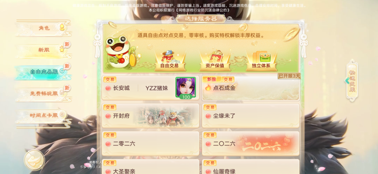大话西游手游交易服搬砖大火区是哪一个?长安城与二〇二六怎么选择?这是最近叶子猪大话群内新手玩家,问得最频繁的一个问题,今天就来给大家详细讲一讲这两个交易大区的区别。 首先,叶子猪感觉比较明显的一点就是,长安城五开上线不用排队,二〇二六和二零二六有时候是需要排队的。但这也从侧面印证了2026交易大服的人气火爆程度。 长安城作为交易服开篇之作,2025年11月18日开启测试,标志着大话手游自由交易体系的正式落地。其定位为“经济试验田”,通过摆摊、当面交易、寄售三大模式,构建了首个玩家主导的市场经济系统。 而二〇二六则是2026年度数字大服,12月30日与二零二六双服同开,主打高成长性与社交属性,通过银两袋、奇珍宝袋等新道具强化快速致富体验。 所以,你要是问叶子猪这两个大区哪个更火一些?答案是两个都火,而且从区内经济来看,长安城目前银两比例是3000:100,二〇二六是3200:100,两者银两及道具物价稳定,都适合新手玩家进入搬砖。 接下来,咱们再看一下大话手游交易服这两个大区的玩家生态,长安城以搬砖党为核心,通过五开刷银两、小号养大号实现资产积累,搬砖收益为月入500-1000元/组号。 二〇二六吸引社交型玩家,宝儿姐、慕清风等神豪组建月影仙阁帮派,带动高端装备交易热潮,就像梦幻西游畅玩服有旭旭宝宝带新区一样,大主播进一步刺激了游戏内经济,也给了搬砖党更多交易机会。 随着大话西游手游2026年数字大服持续发力,二〇二六的高成长性与长安城的经济稳定性将形成互补。两者开区时间相近,区内经济发展到现在,已经趋于稳定,自由交易系统成熟,适合新老玩家长期搬砖。 总的来说,大话官方在交易服这一块做得确实不错,比如相较于长安城老区,官方二〇二六通过双服分流机制优化体验,吸引超500万玩家入坑,进一步巩固大话手游的搬砖生态优势。 当然如果你怕跟不上大家进度,也可以选择点石成金,春节新服进行手游搬砖,新区支持三日卡(9元)+银两续费模式,可降低新手试错成本。搬砖勤快的朋友,甚至有可能实现零成本搬砖,在半个月内就能赚回月卡。 以上就是今天的所有内容,叶子猪先祝各位朋友马年新春快乐,马上发财,也欢迎大家加入叶子猪大话手游交易服&交流群,我们一起唠唠嗑、吹吹水,赚点红包钱嘿嘿~ [编辑:ssc]